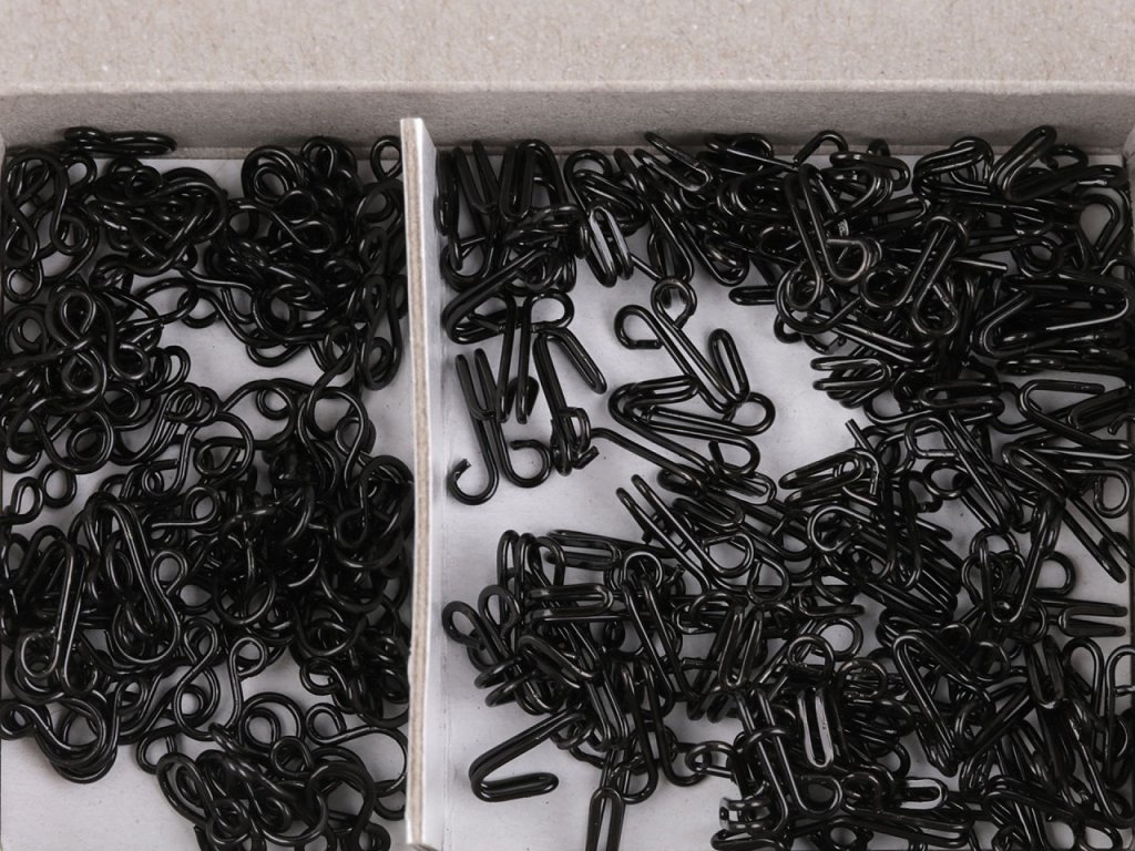 Zapínání na očko a háček je vyrobeno z kvalitního kovu. Používá se na oděvy a připevňuje se přišitím.