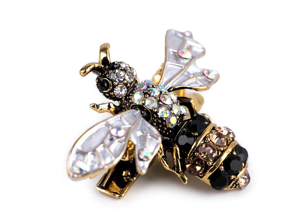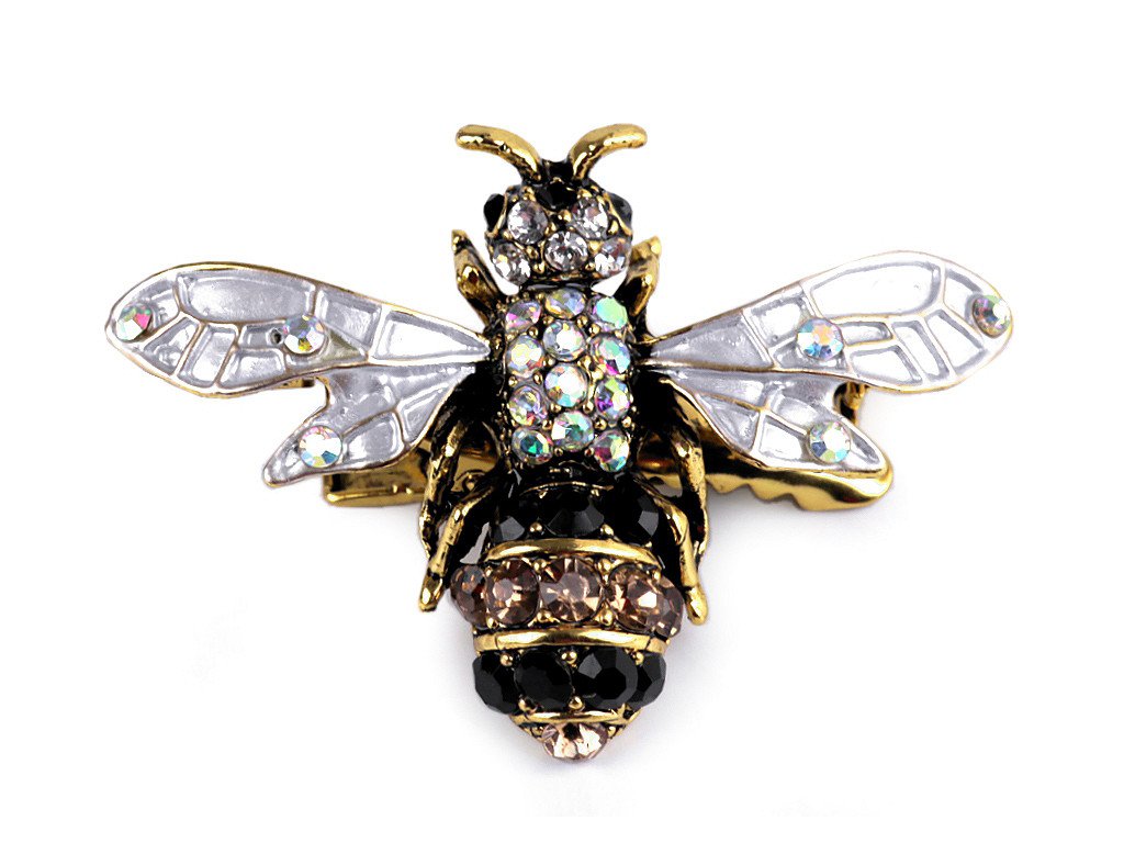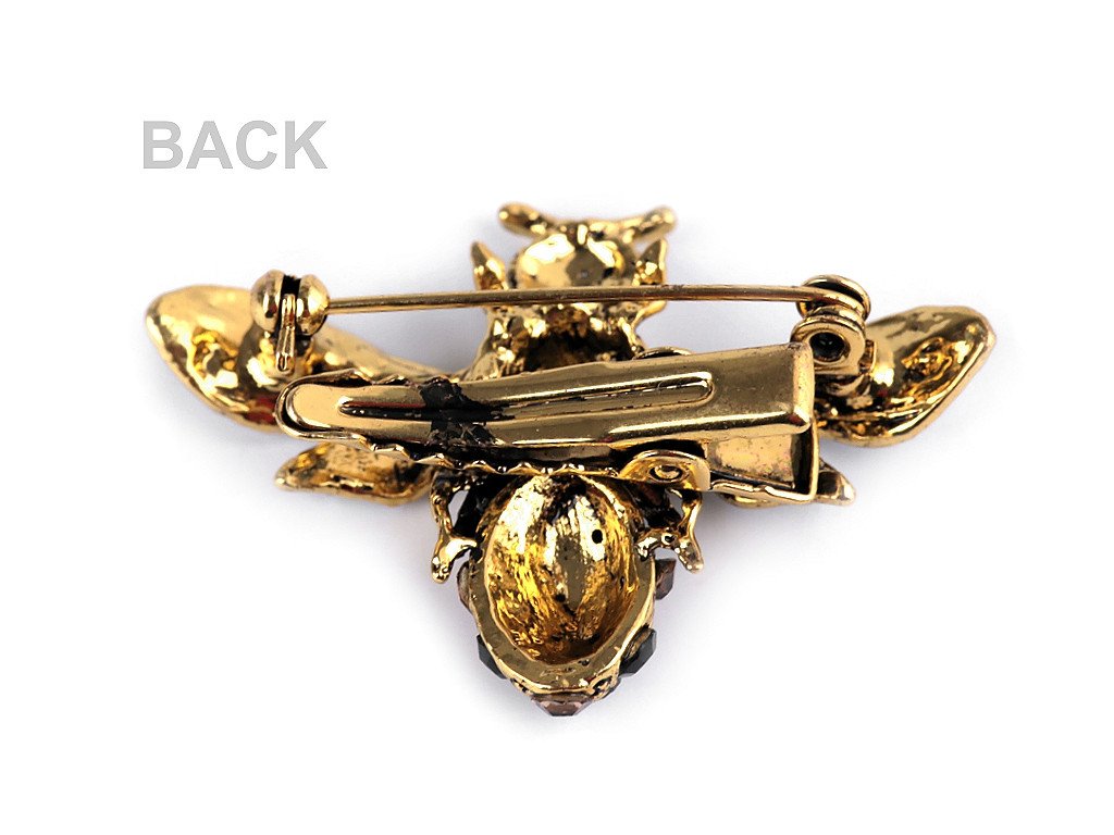 Elegantní brož včely působí velice přepychově. Celé tělo je osázené drobnými broušenými kamínky, které se oslnivě třpytí. Kamínky uprostřed mají AB lesk. Na zadní straně je spínací špendlík s pojistkou proti otevření a klips, který využijete k připnutí na klopu saka, tašku apod. Brož můžete nosit nejen na oděvech, ale hodí se i k ozdobení klobouků či sepnutí šátku. Je na plastové kartě, která se dá zavěsit na prodejní stojany.