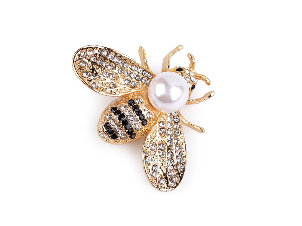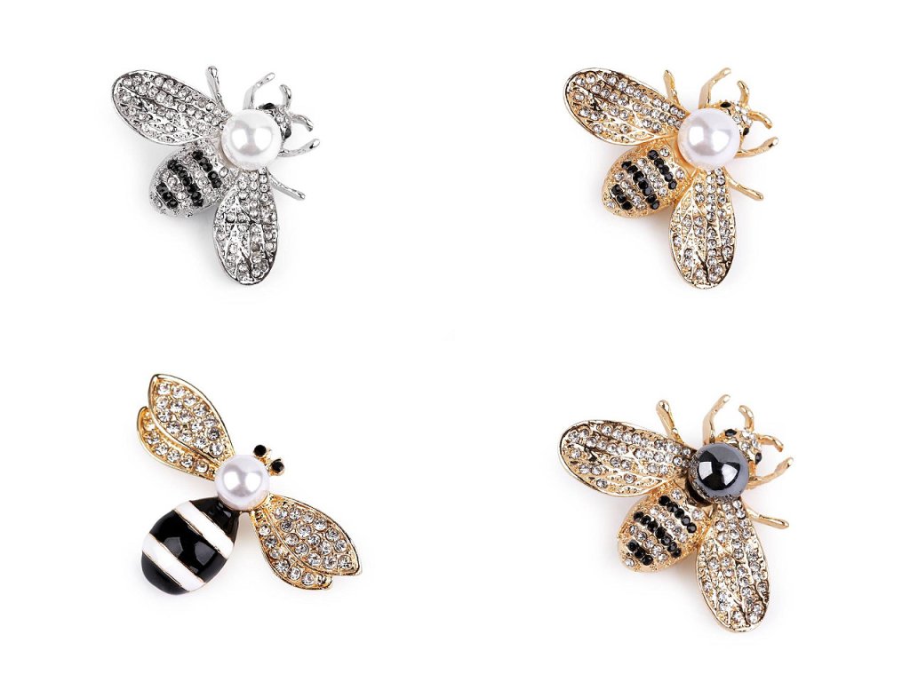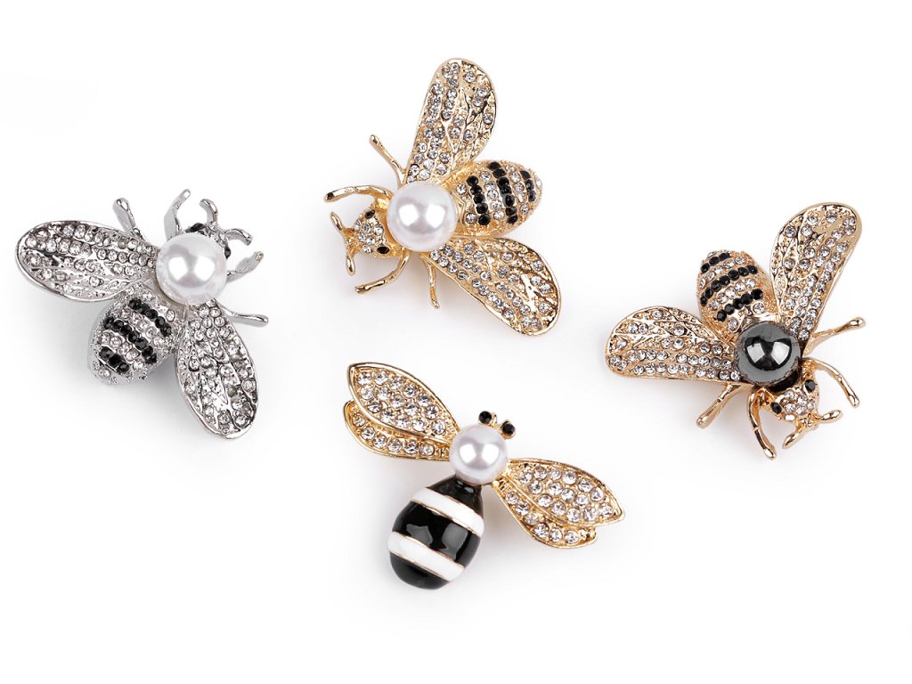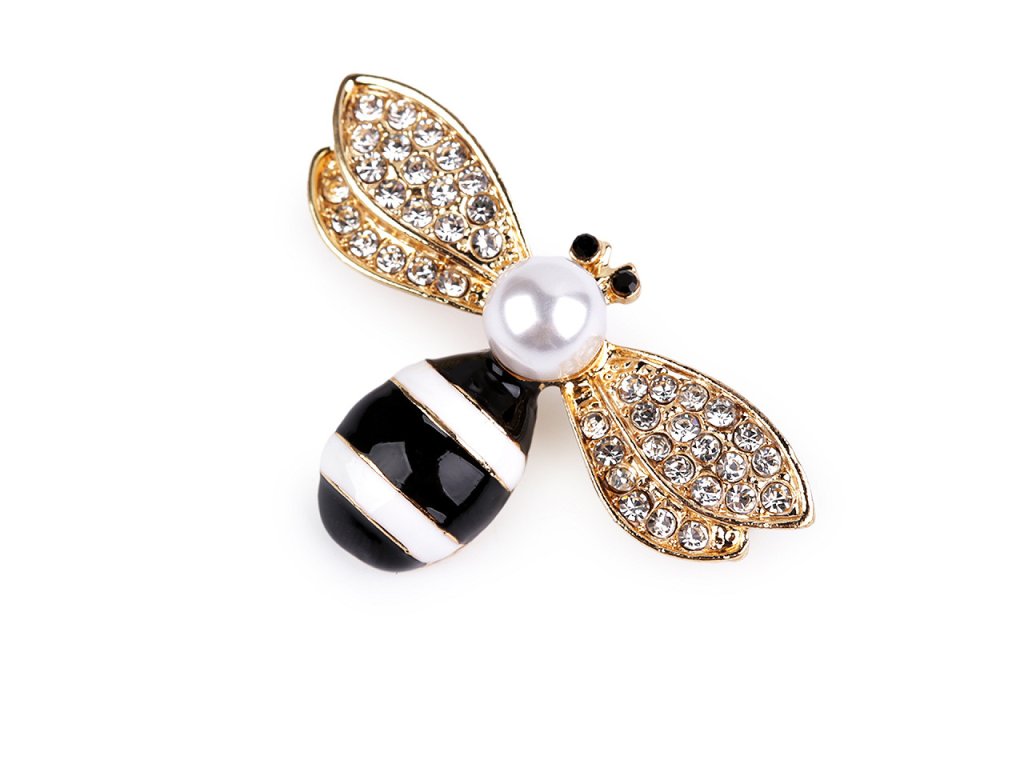 Kovová brož včely je ozdobená broušenými kamínky díky kterým se poutavě třpytí. Uprostřed má umístěnou lesklou perlu. Působivě doladí oděvy i doplňky jako jsou kabelky, klobouky, šátky apod. Zapíná se pomocí brožového špendlíku.