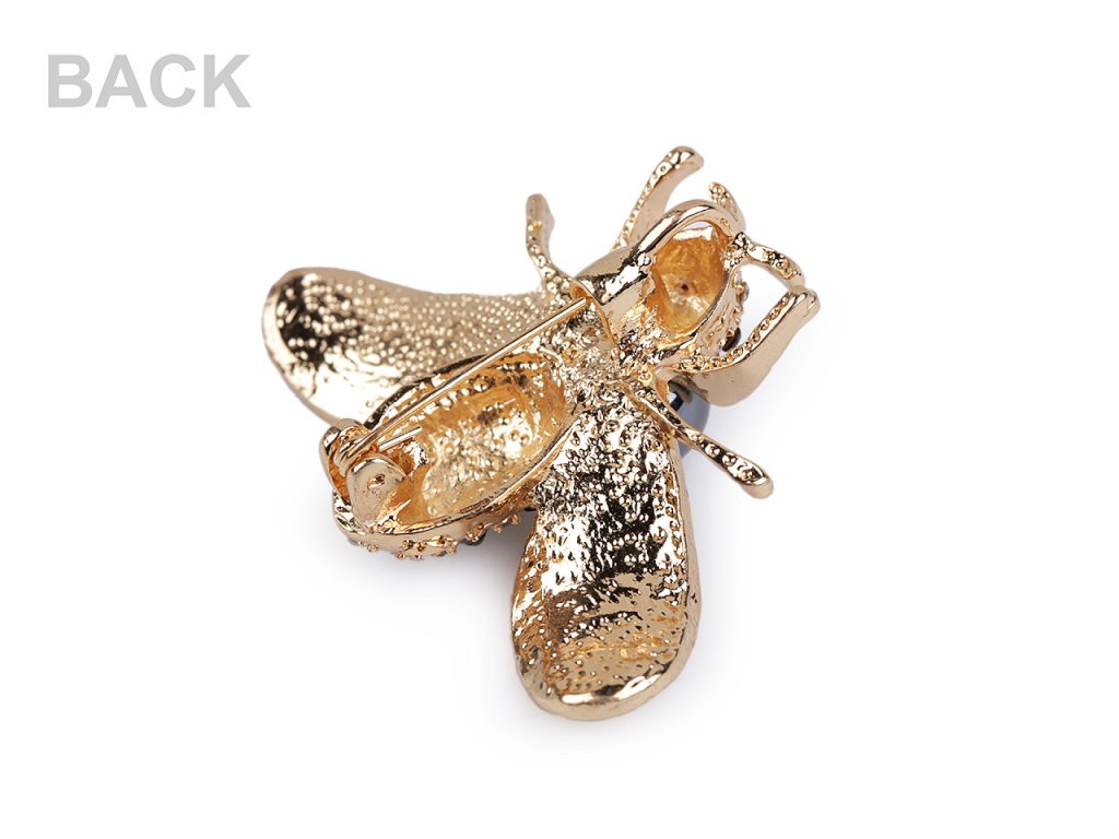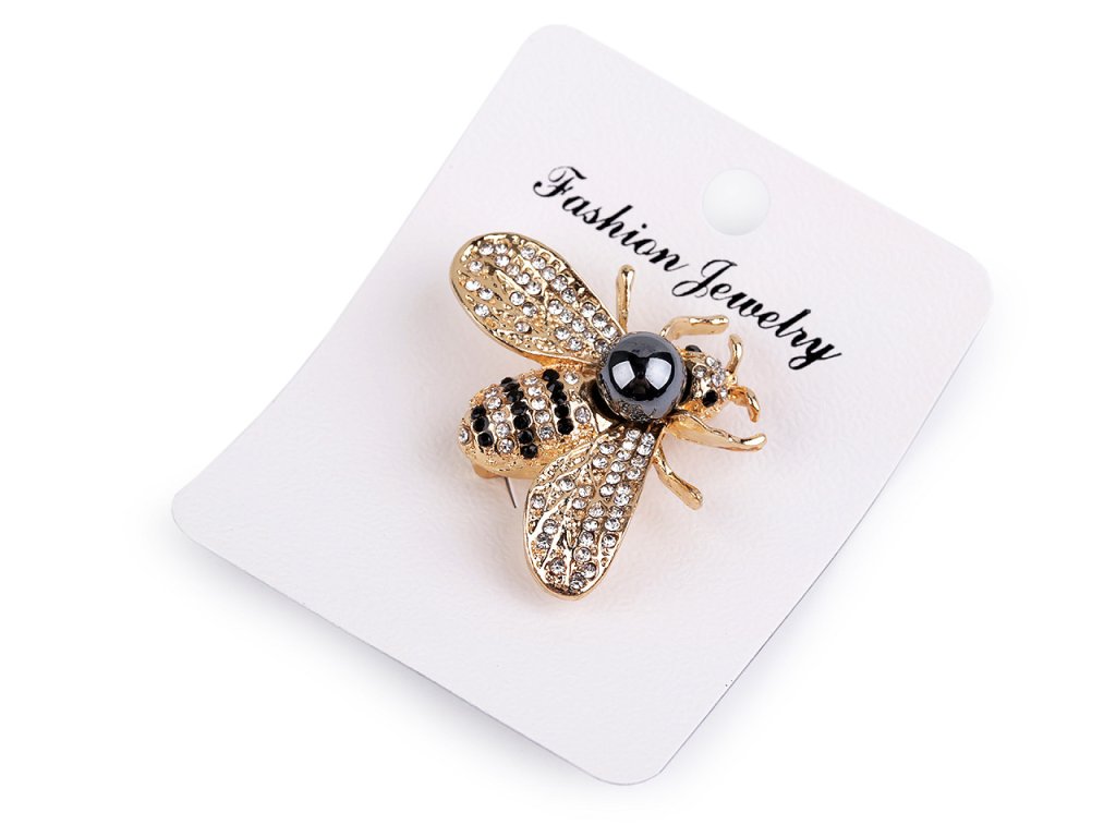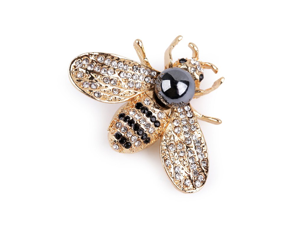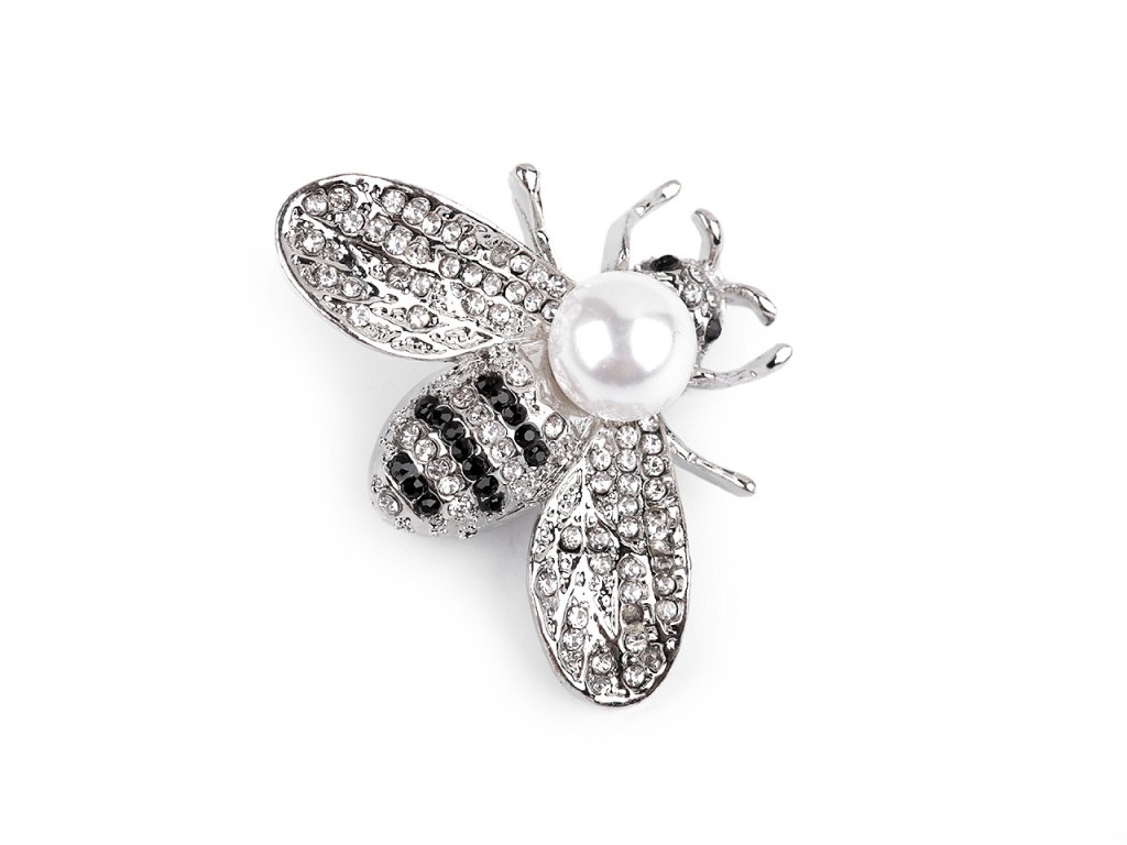 Kovová brož včely je ozdobená broušenými kamínky díky kterým se poutavě třpytí. Uprostřed má umístěnou lesklou perlu. Působivě doladí oděvy i doplňky jako jsou kabelky, klobouky, šátky apod. Zapíná se pomocí brožového špendlíku.