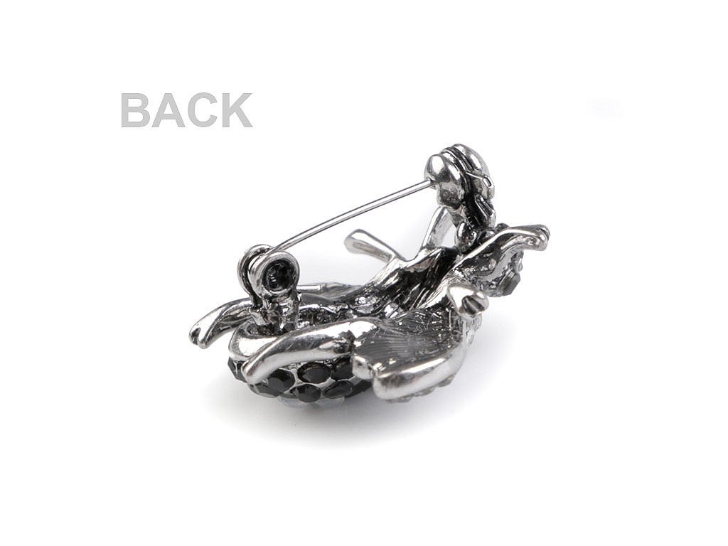 Elegantní brož s broušenými kamínky působí velice přepychově. Kvalitní kovový základ je osázený drobnými broušenými kamínky, které se krásně třpytí. Zapíná se pomocí spínacího špendlíku, který má pojistku proti nechtěnému otevření.