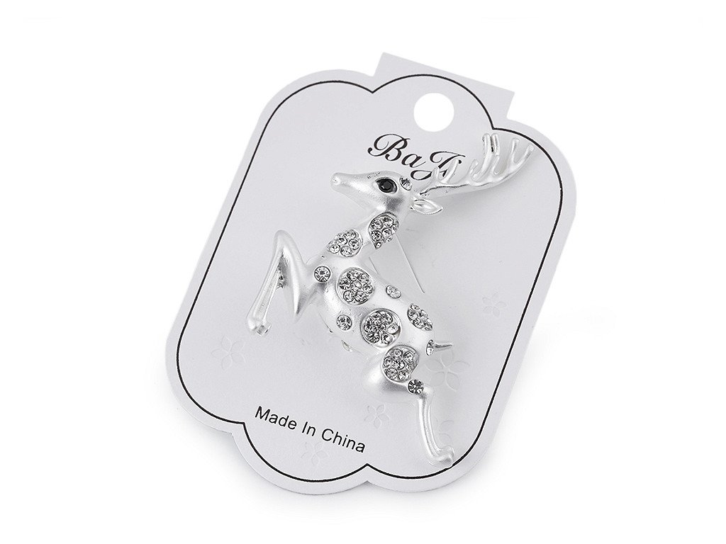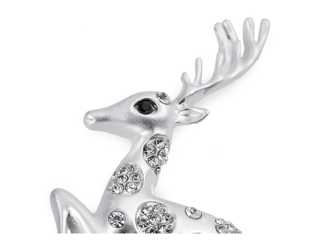 Elegantní brož s jelenem bude zajímavým doplňkem vašeho oděvu. Díky třpytivým broušeným kamínkům skvěle dozdobí košile, saka, svetry, kabelky či čepice. Má matnou povrchovou úpravu.