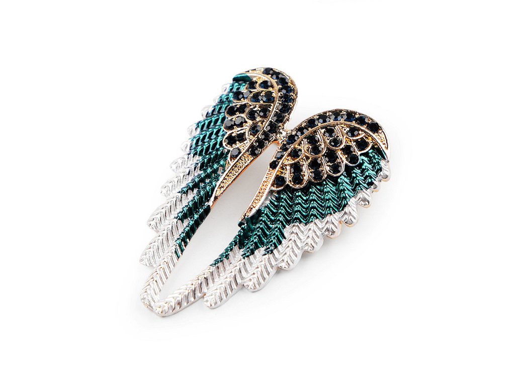 Brož křídel s barevným smaltem je velice poetická. Je ozdobená broušenými kamínky s jemným leskem, můžete ji využít na běžné nošení i na společenské události - návštěvy divadel, oslavy apod. Z rubu má brožový špendlík. Můžete ji nosit nejen na oděvech, hodí se i k ozdobení klobouků, tašky či sepnutí šátku.