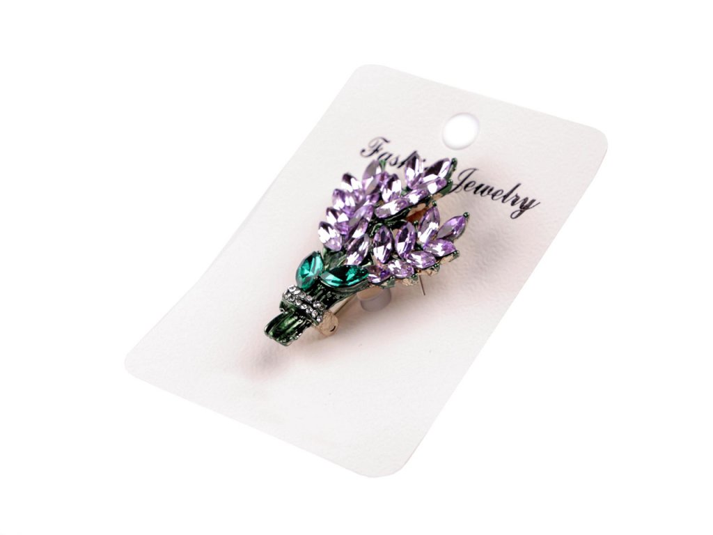 Brož ve tvaru levandule je velice elegantní, je ideálním dárkem pro ženy všech věkových kategorií. Je osázená broušenými kamínky, které se krásně třpytí. Zapíná se pomocí brožového špendlíku.