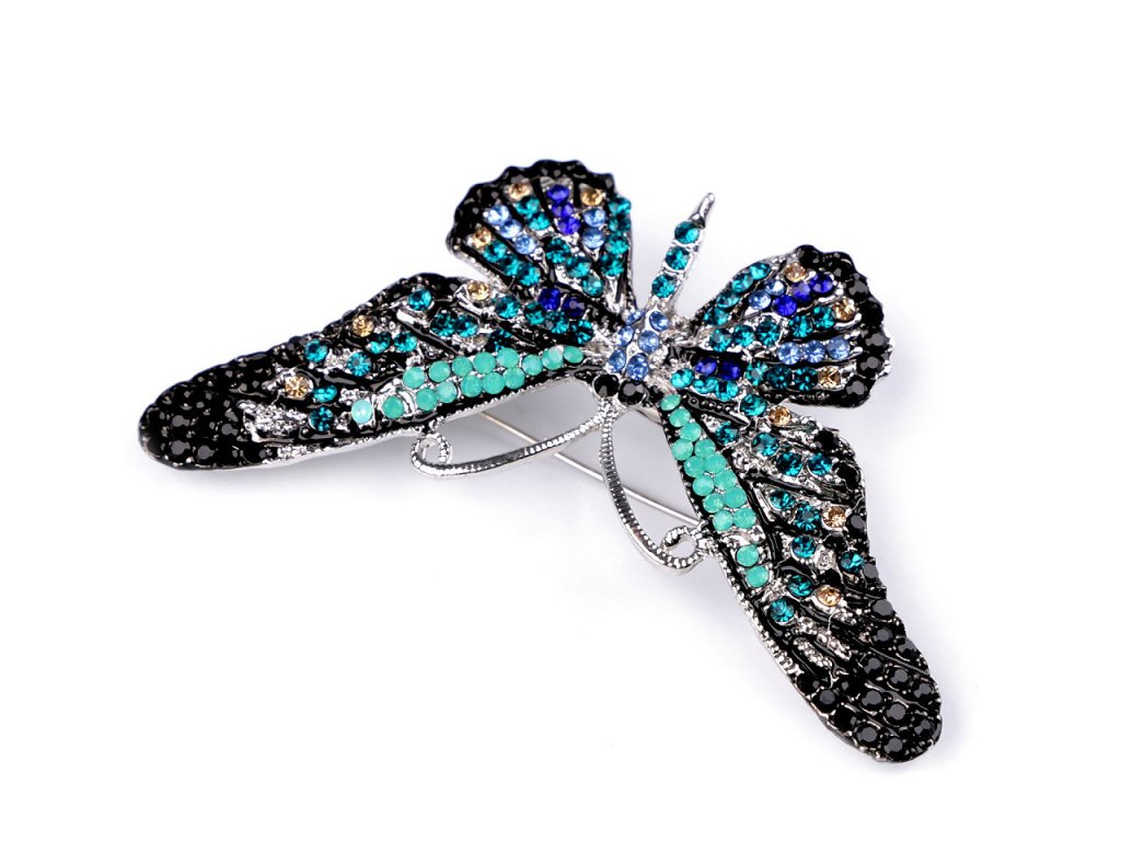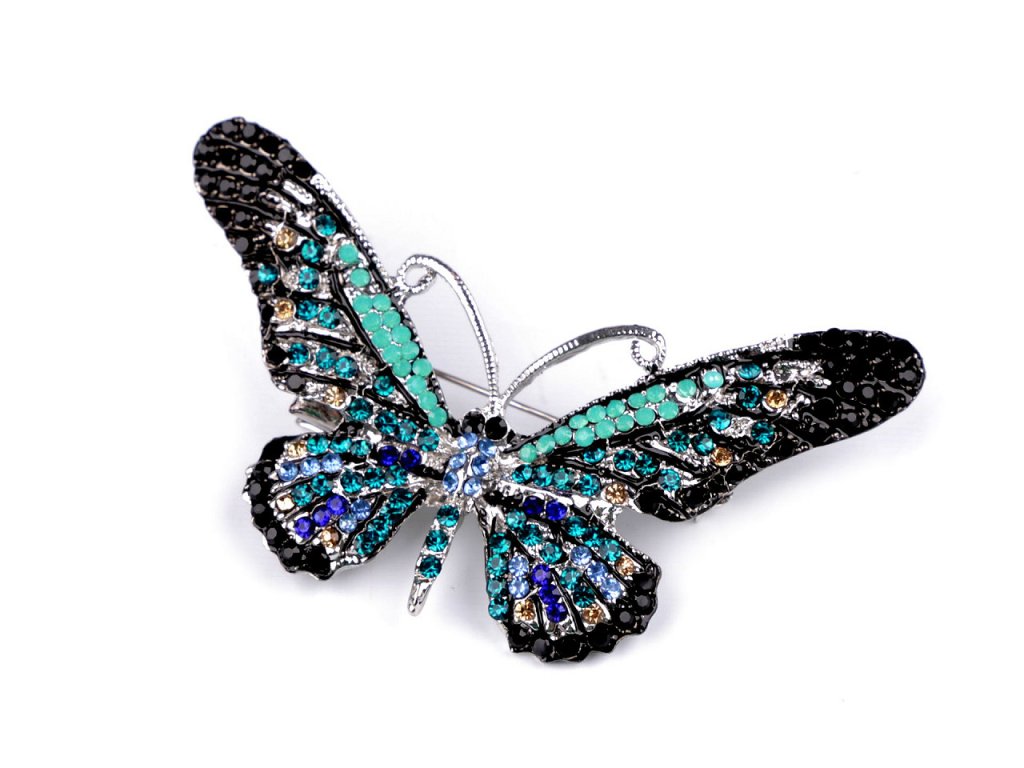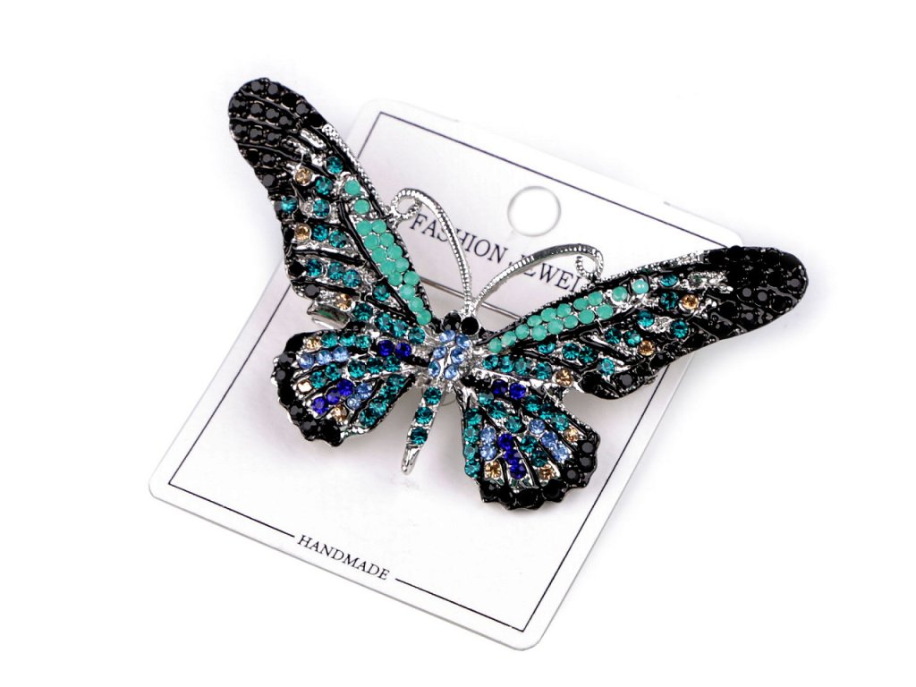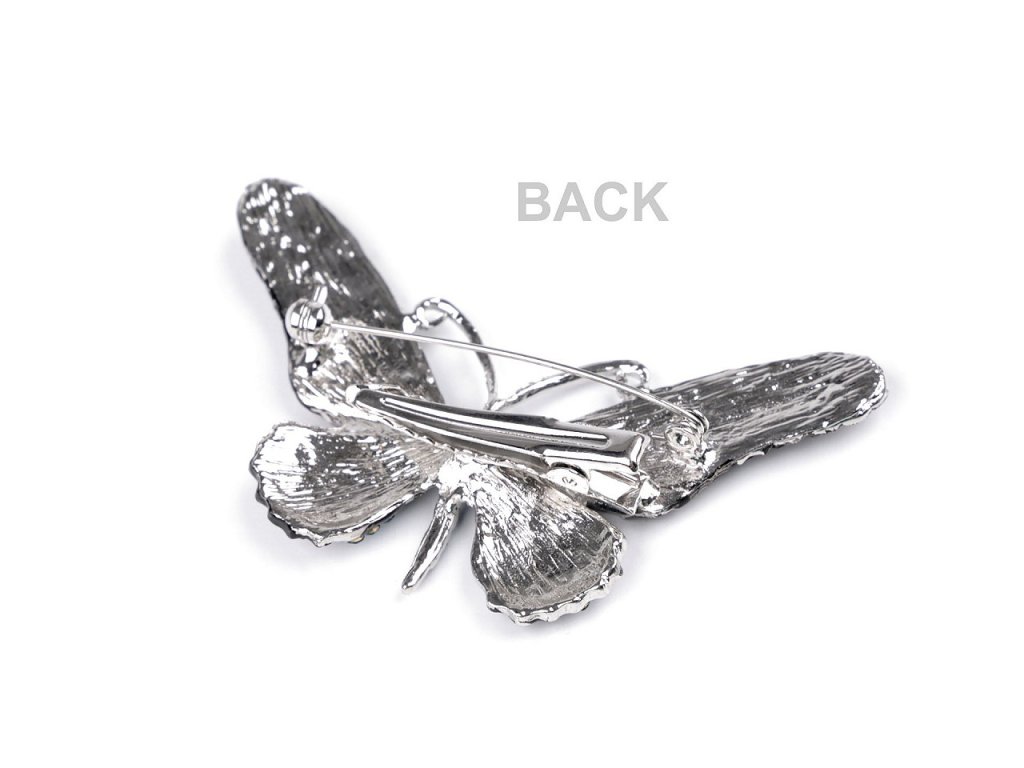 Elegantní brož ve tvaru motýla je nepřehlédnutelná. Je osázená drobnými broušenými kamínky, které se krásně třpytí. Zapíná se pomocí spínacího špendlíku, který má pojistku proti nechtěnému otevření. Na zadní straně je i klips se zoubky, který využijete např na klopě, která je z materiálu, jenž nechcete propíchnout.