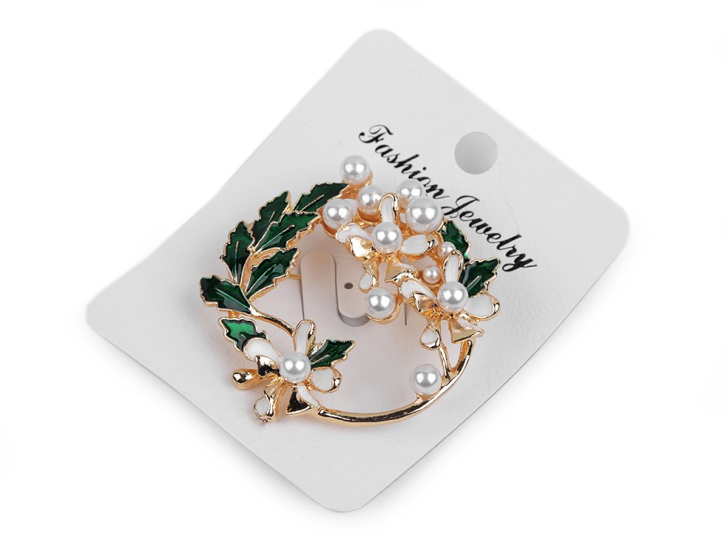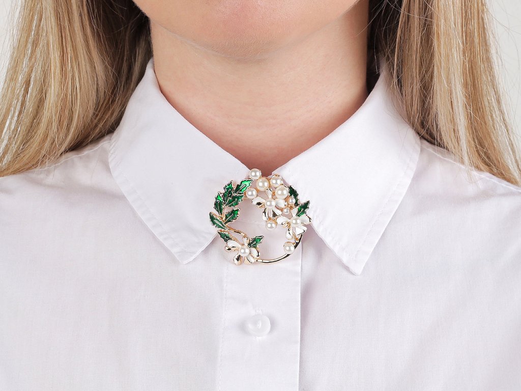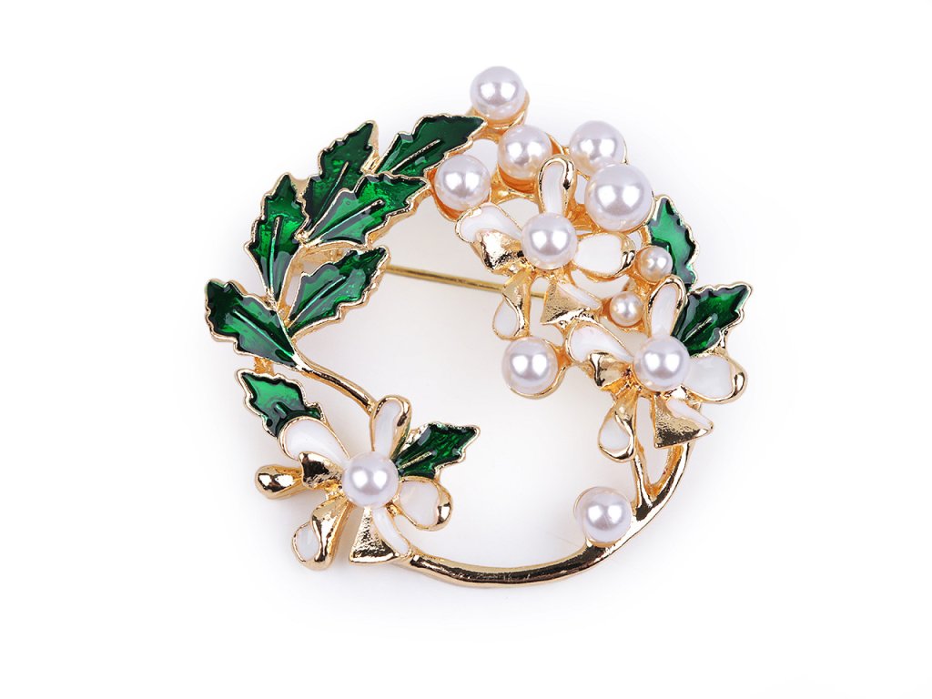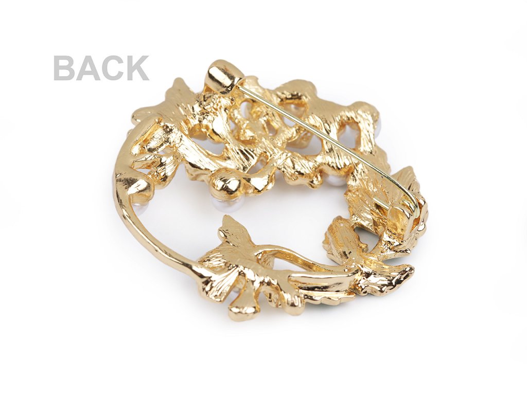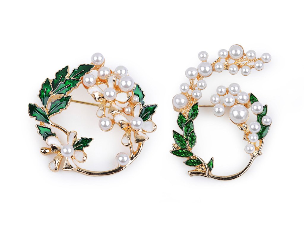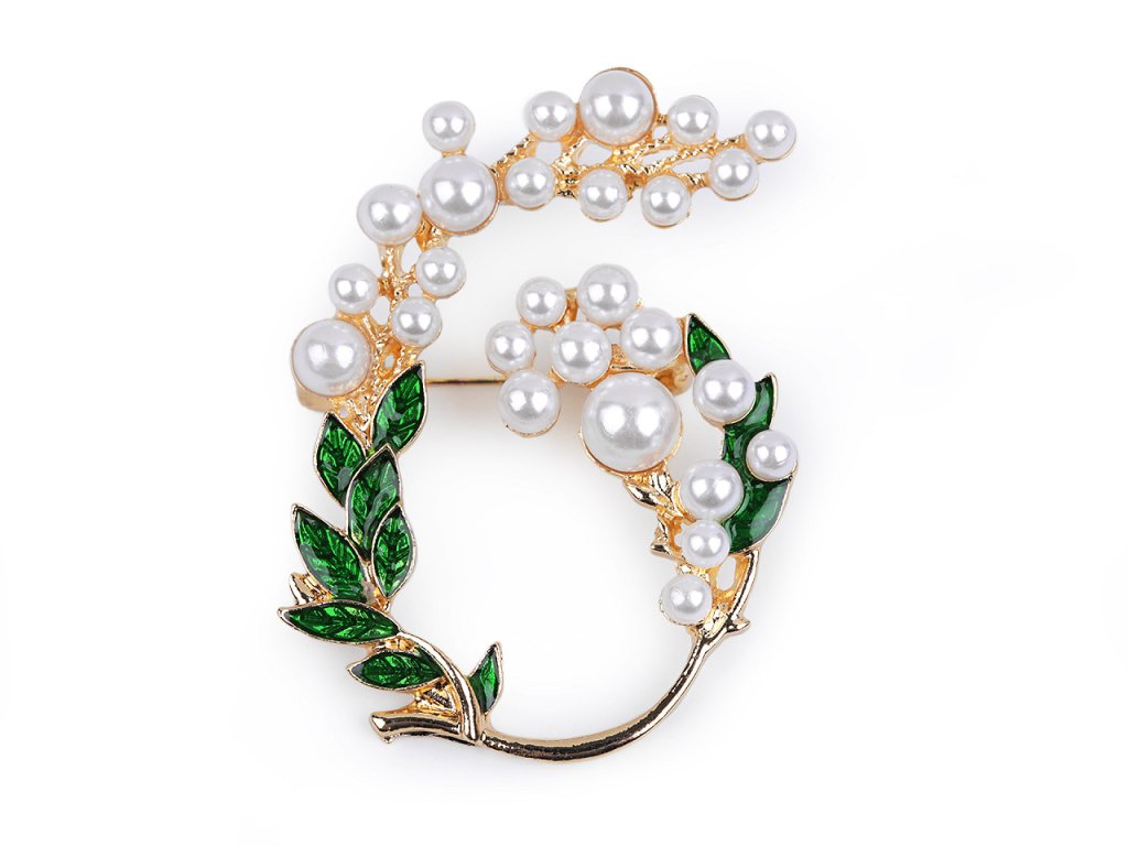 Elegantní brož s rostlinným motivem se smaltem bude perfektním doplňkem vašeho oděvu. Díky perlám skvěle dozdobí halenky, šaty, saka, svetry, kabáty, kabelky či čepice. Hodí se i na ozdobné sepnutí šátku.