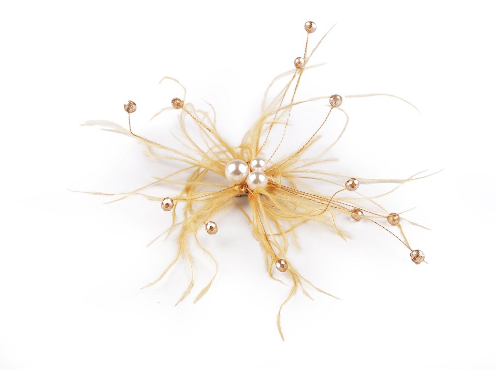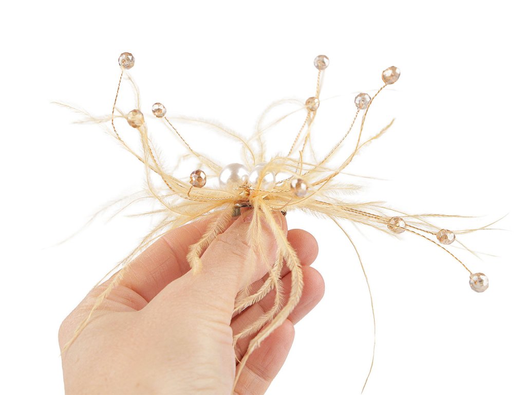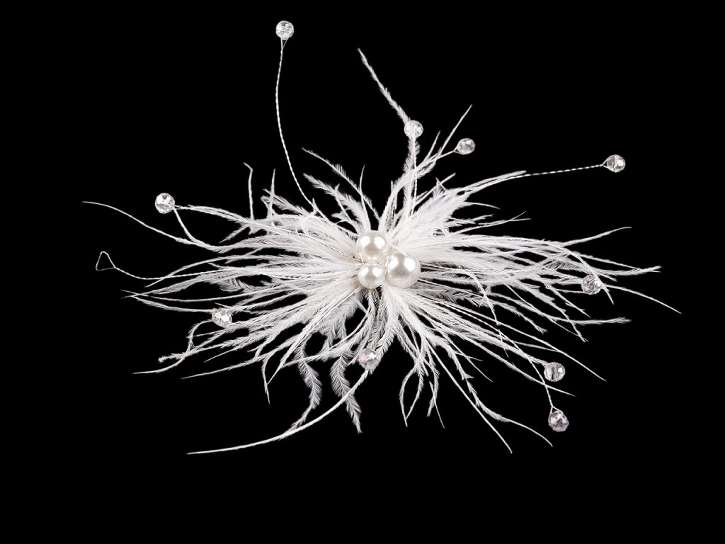 Velká elegantní brož je ozdobená perlami, broušenými korálky a nadýchaným pštrosím peřím. Je naprosto úchvatná, navozuje dojem rozevlátého střapatého květu či sněhové vločky. Díky drátkům ji můžete libovolně tvarovat. Můžete ji nosit na oděvech, kloboucích, kabelkách či s ní můžete sepnout šátek. Na zadní straně má brožový špendlík.