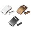 Kovová spona s koncovkou je určená na výrobu popruhových (látkových) opasků. Spona má na jedné straně zoubky, které popruh dobře zafixují a přidrží, takže materiál nebude prokluzovat. Koncovku připevněte kleštěmi na konec opasku.