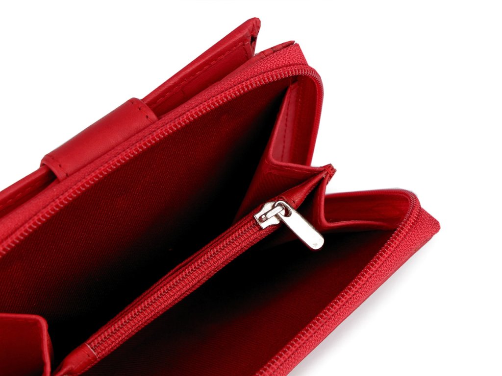 Přední část peněženky se uzavírá na zápinku na patent. Uvnitř je spousta přihrádek na kreditní karty, některé jsou průhledné, na doklady. Za nimi se nachází 2 dlouhé přihrádky na bankovky. V zadní části peněženky je samostatně umístěný mincovník. Uzavírá se na zip, uvnitř má 2 přihrádky oddělené přepážkou. V přepážce je poslední malá kapsička na zip.
