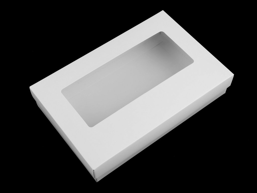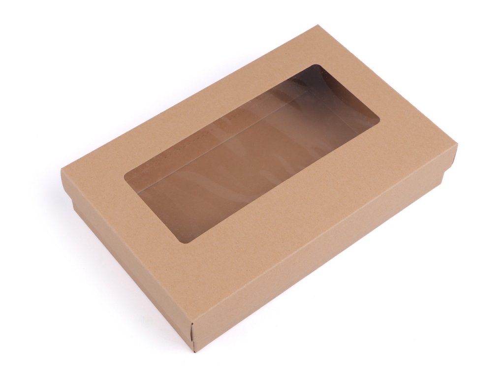 Papírová krabice s obdélníkovým výřezem ve víku z průhledné fólie. Využijete ji na balení dárků, šátků, rukavic apod. Můžete si ji i dozdobit podle svého vkusu.