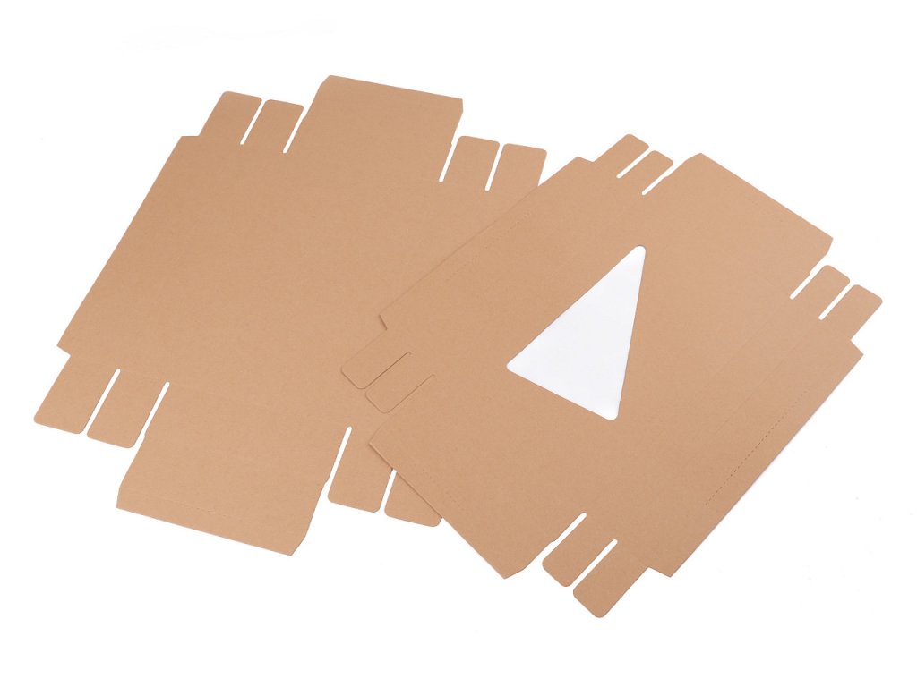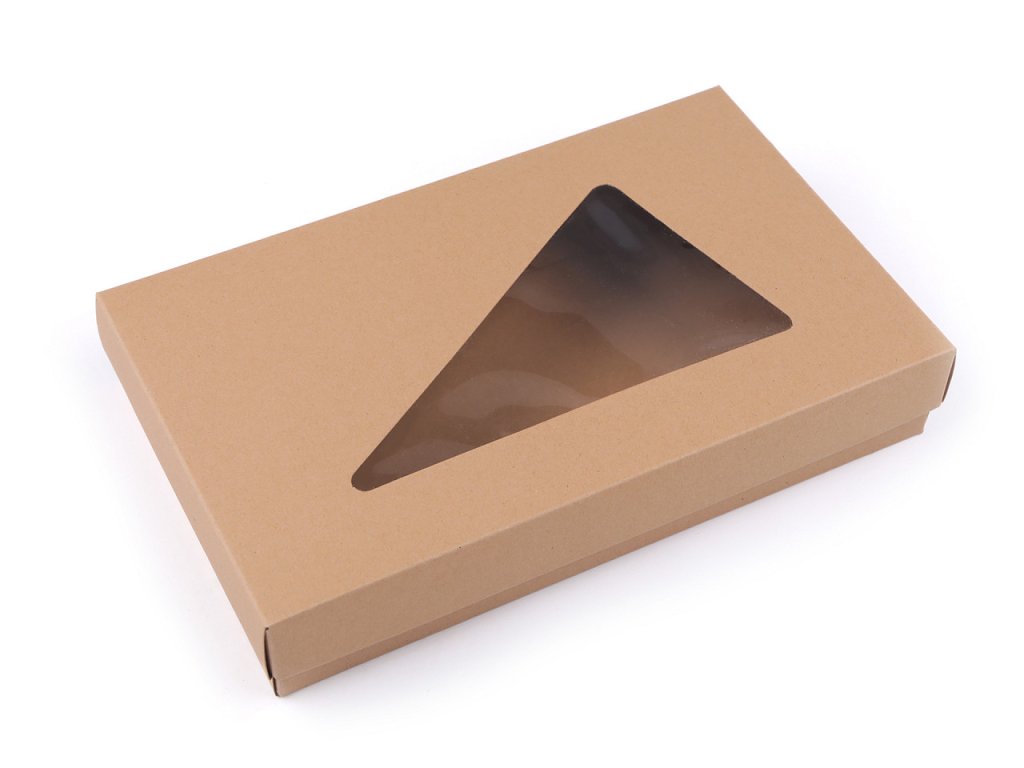 Papírová krabice má trojúhelníkový výřez ve víku z průhledné fólie. Využijete ji na balení dárků, šátků, rukavic apod. Můžete si ji i dozdobit podle svého vkusu.