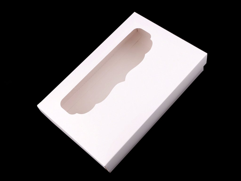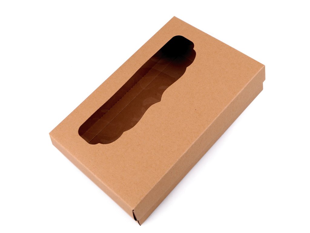 Papírová krabice má ozdobný výřez ve víku z průhledné fólie. Využijete ji na balení dárků, šátků, rukavic apod. Můžete si ji i dozdobit podle svého vkusu.