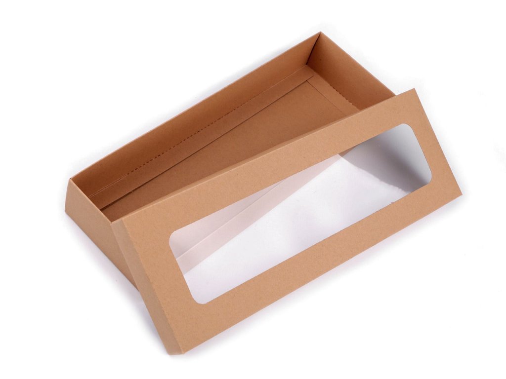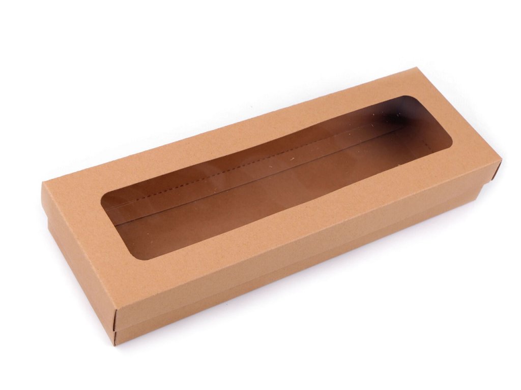 Dlouhá papírová krabice má výřez ve víku z průhledné fólie. Využijete ji na balení dárků, šátků, kravat, dlouhých rukavic apod. Můžete si ji i dozdobit podle svého vkusu.