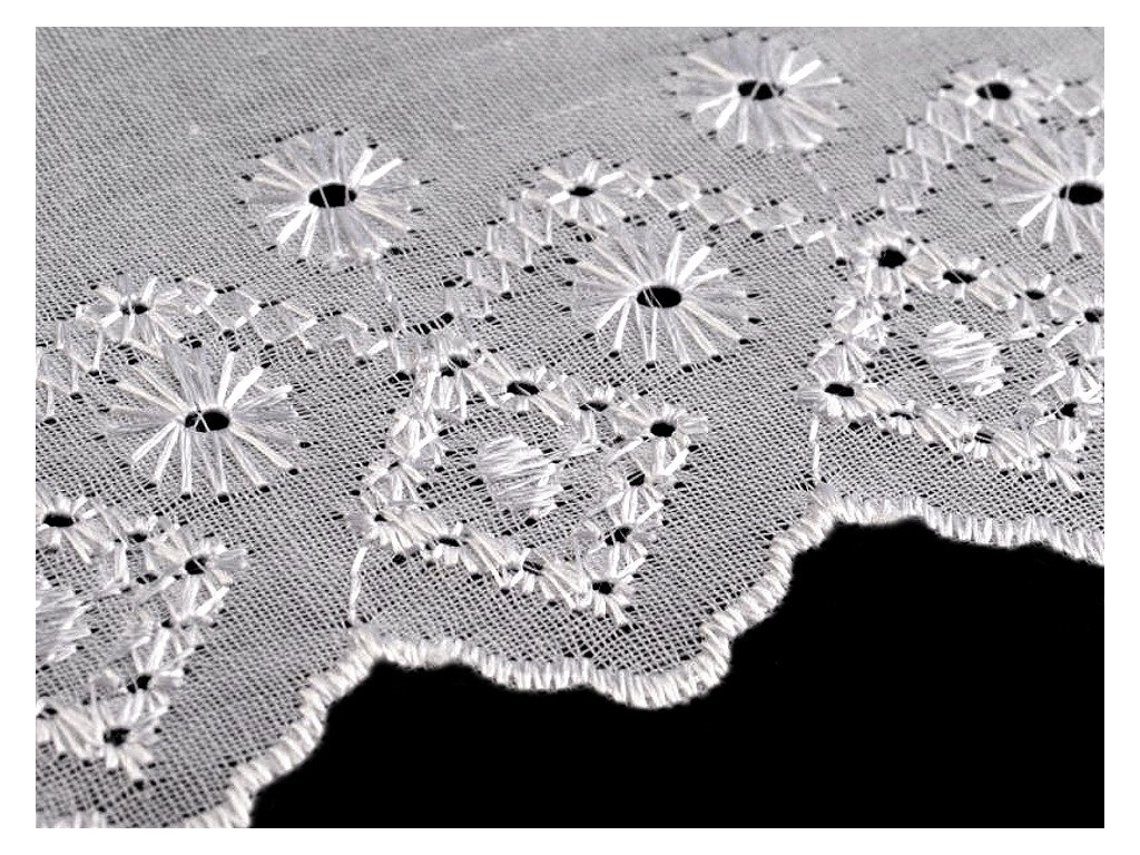 Madeiru zdobí designový motiv s lesklou dírkovou výšivkou.