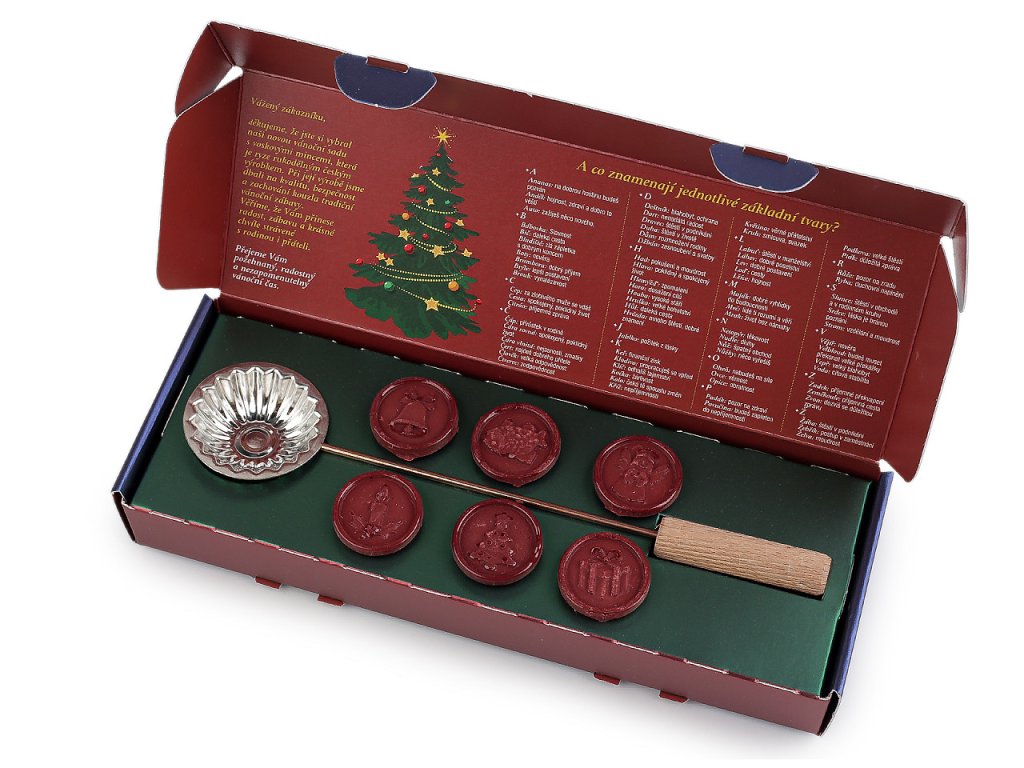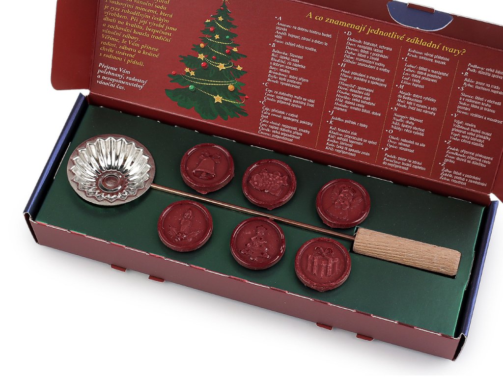 Vánoční souprava lití olova obsahuje vše, co budete k tradičnímu lití olova potřebovat - pánvičku na tavení a 6 olověných mincí ozdobených vánočními reliéfy. To vše zabalené v krásné dárkové krabici.