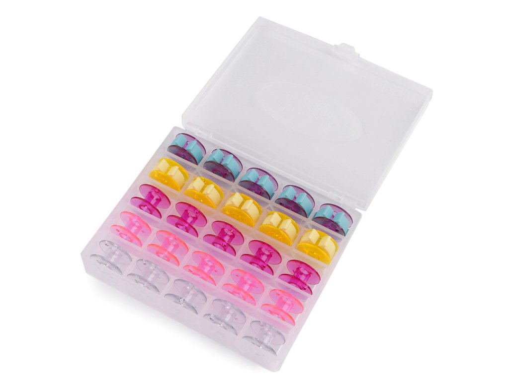 Box s cívkami k šicímu stroji je při šití skvělým pomocníkem. Uvnitř najdete 15 ks klasických cívek a 10 ks cívek se speciálním držákem, díky kterému se nitě samovolně neodmotají.