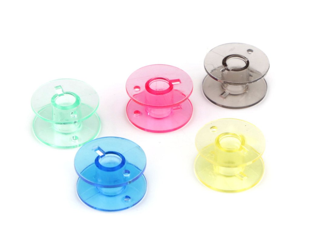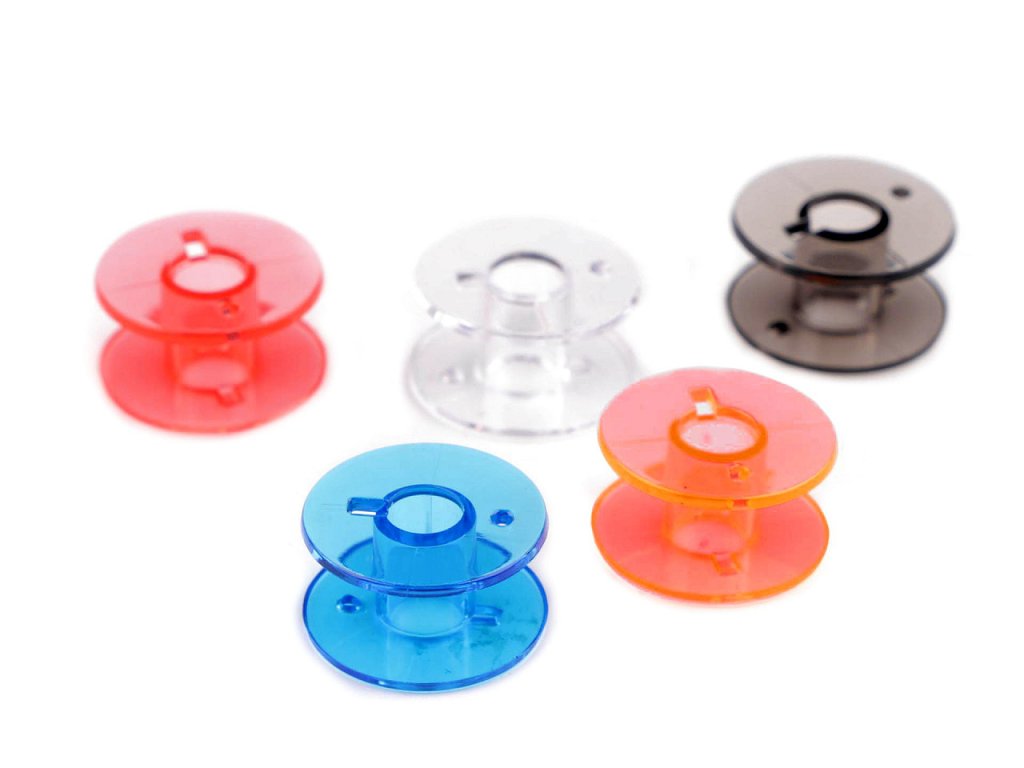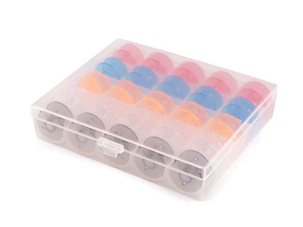 Uvnitř praktického boxu najdete 25 cívek (výška 11,3 mm, Ø20 mm, vnitřní Ø6,3 mm). Díky průhlednému plastu, ze kterého je box vyrobený, budete mít dokonalý přehled o cívkách i barvách nití na nich namotaných. Máme odzkoušené v domácích šicích strojích.