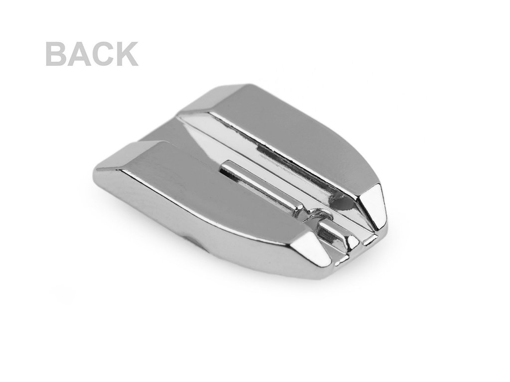 Kovovou patku využijete při všívání skrytých zipů, které, když jsou dobře přišité, vypadají jako součást švu. Patka má zespodu dvě drážky, které slouží k přidržení zipu na stejném místě během přišívání. Rychloupínací systém patky je vhodný pro většinu domácích šicích strojů.