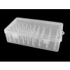 Box s pákovým uzavíráním využijete na uskladnění 42 ks špulek s nitěmi. Díky kolíkům, které jsou na dně boxu, zůstanou nitě na svém místě. 12 kolíků má mezi sebou větší mezery, jsou vhodné na nitě s větším návinem.