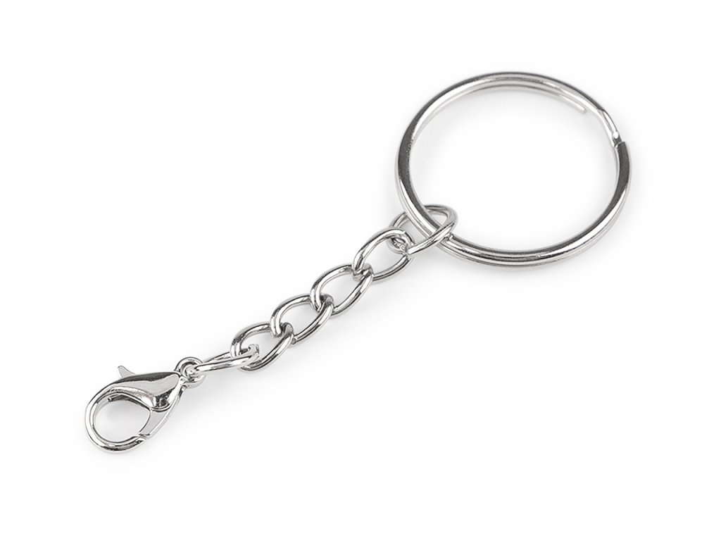 Kroužek s řetízkem doplňuje malá karabinka na konci řetízku. Využijete ho na klíče, přívěsky na batohy, kabelky apod.
