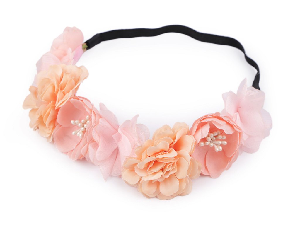 Čelenka s květy je velice romantická, je nádherná v rozpuštěných i zapletených vlasech. Neměla by chybět v účesu žádné družičky. Na spleteném copánku z voskovaných šňůrek jsou připevněné textilní květy. Do copánku je vpletený prýmek s lístečky. Zadní část tvoří pružná guma. Čelenka pevně drží, nepadá, je velice příjemná na nošení.