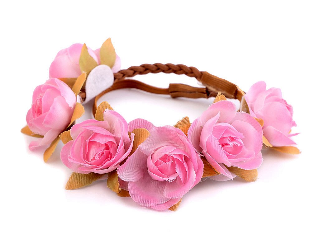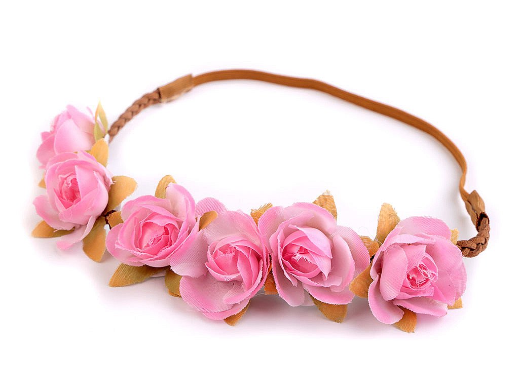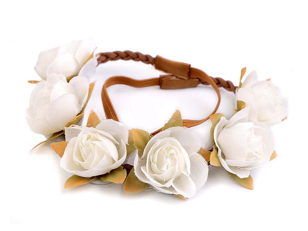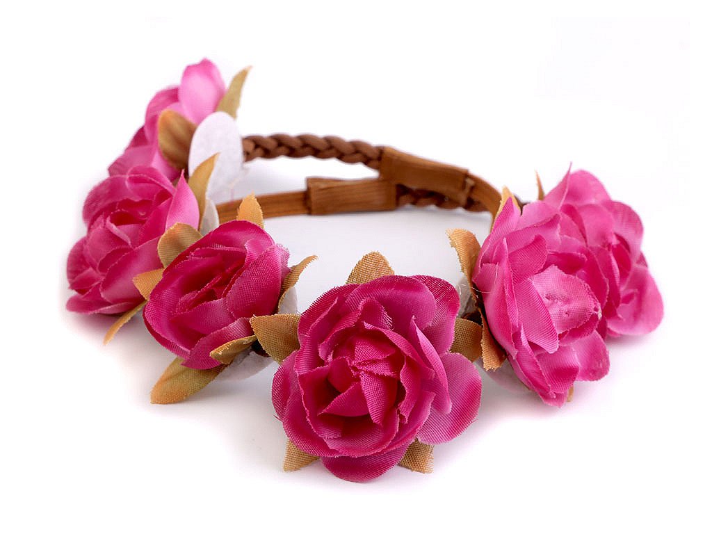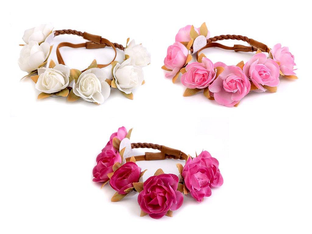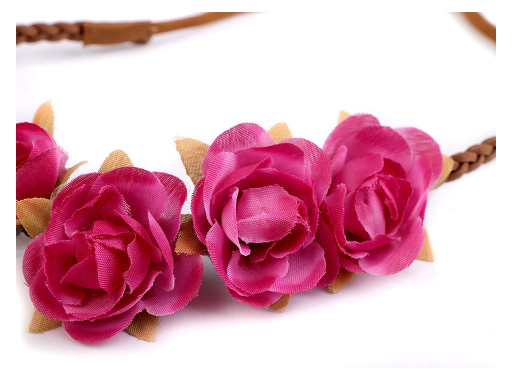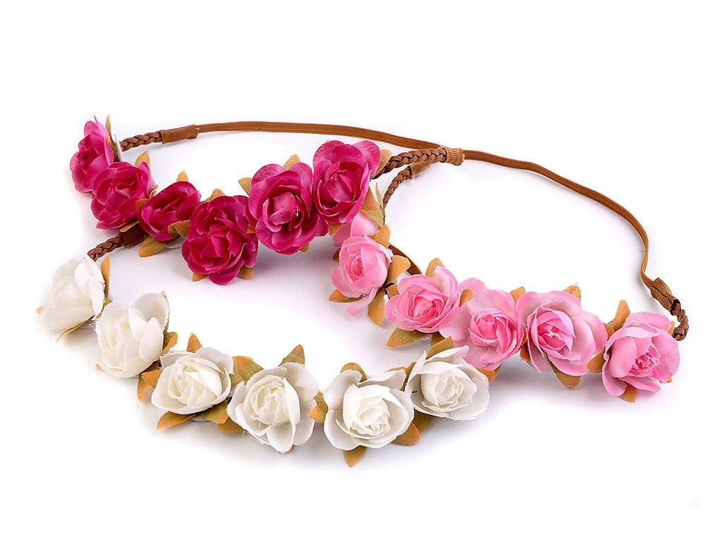 Čelenka s květy růží vypadá skvěle v rozpuštěných i zapletených vlasech. Využijí ji i dívky, které čeká První svaté přijímání, neměla by chybět v účesu žádné družičky. Na spleteném copánku z eko kůže jsou připevněné textilní květy. Zadní část tvoří pružná guma. Čelenka pevně drží a nepadá, je velice příjemná na nošení.