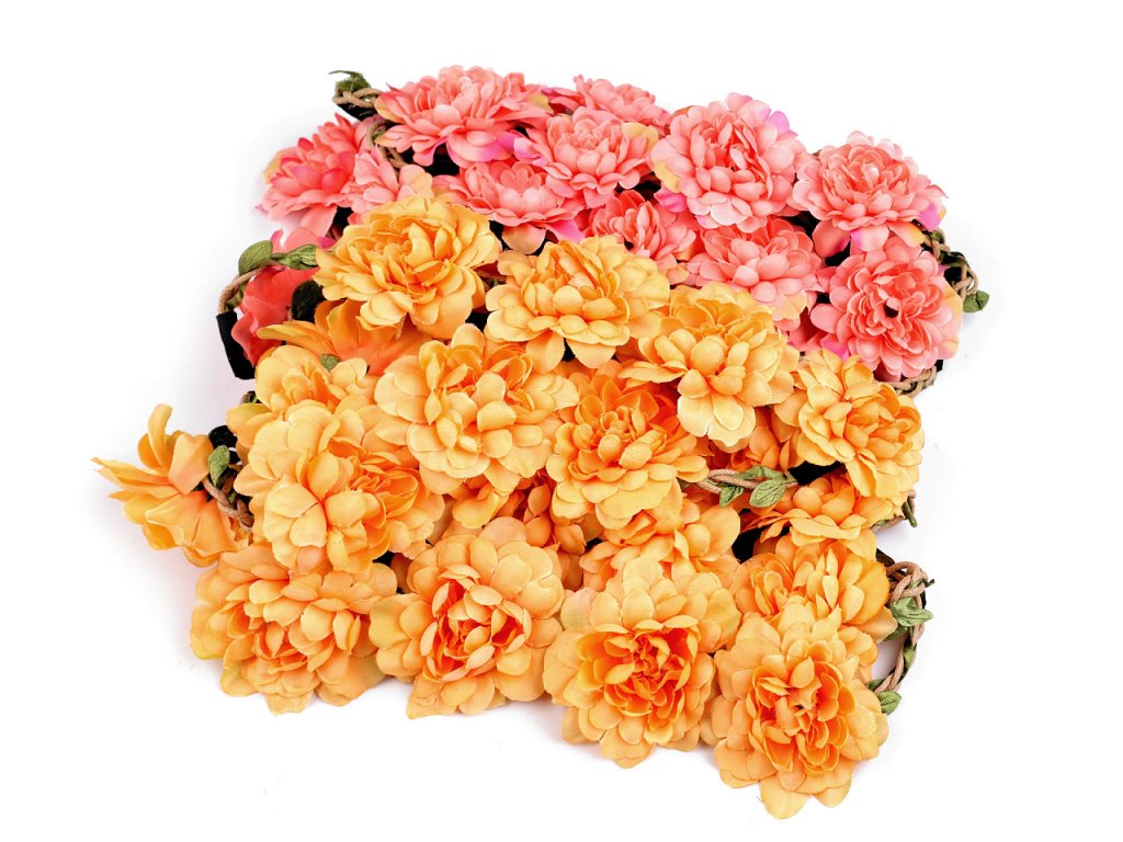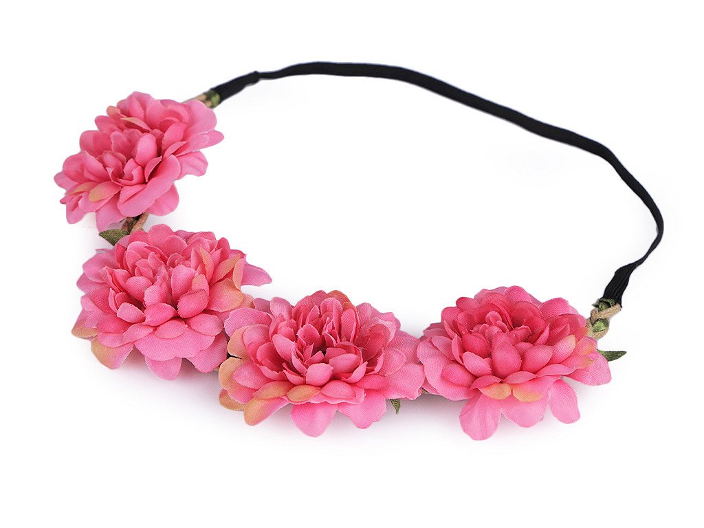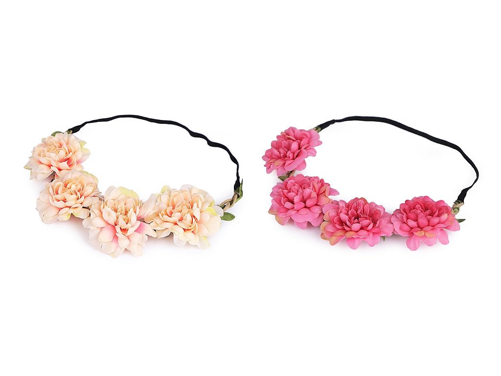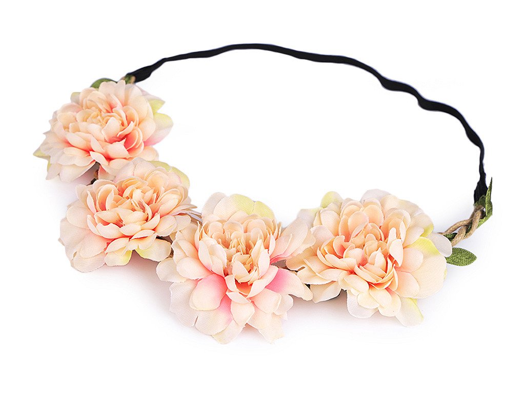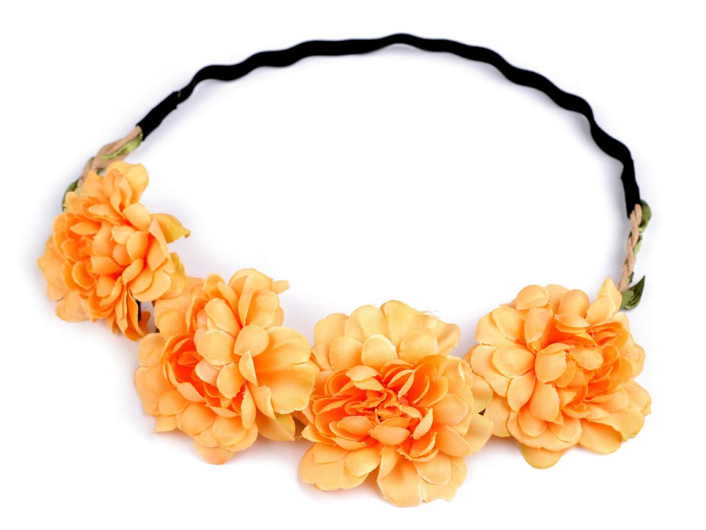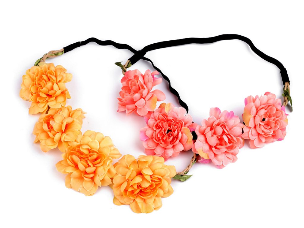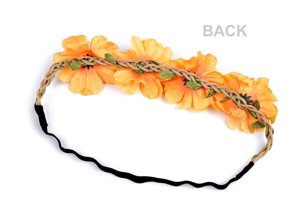 Bohémská čelenka s květy romanticky ozdobí váš účes. Květy jsou bohaté, zajímavě probarvené. Jsou připevněné k copánku z voskovaných šňůrek. Do copánku je vpletený prýmek s lístečky.
