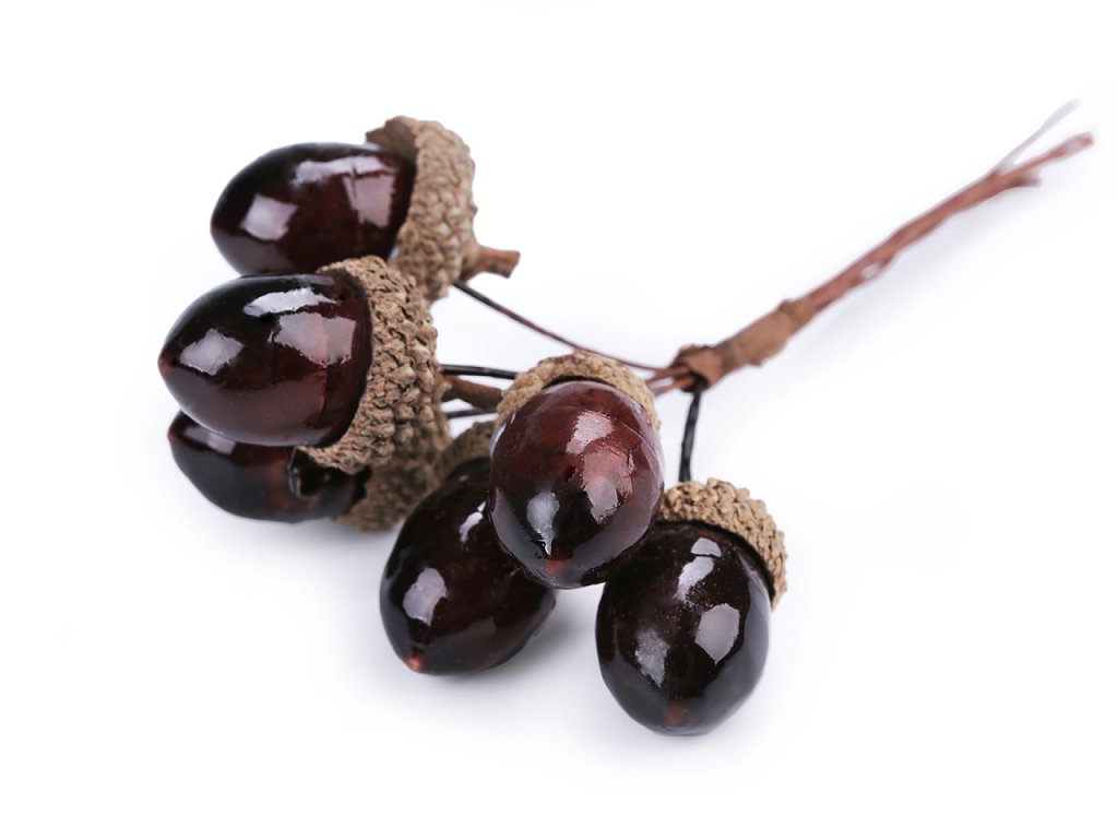 Dekorační žalud je vyrobený z polystyrenu, kalíšek je přírodní. Ve stonku je drát, takže ho můžete libovolně tvarovat. Plody žaludu vyniknou v podzimních vazbách, věncích apod.
