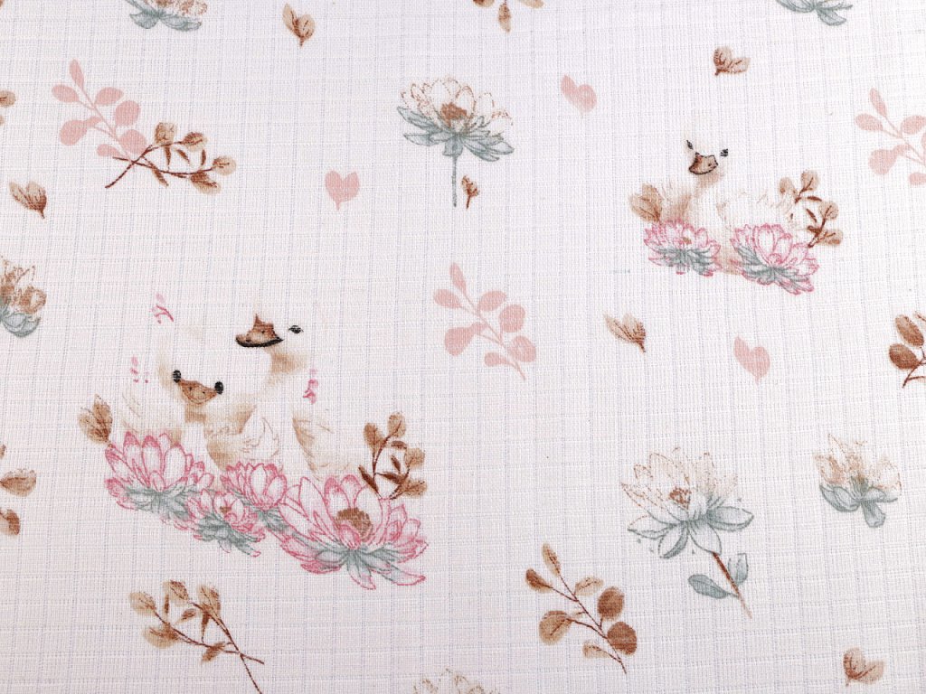 Bavlněná plenkovina s roztomilými motivy hus je vzdušná a příjemná na dotek. Využijete ji na šití plenek, baldachýnů, bryndáčků apod.