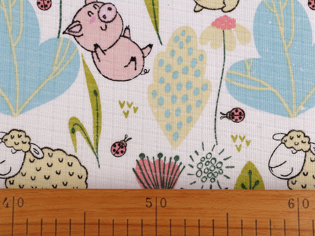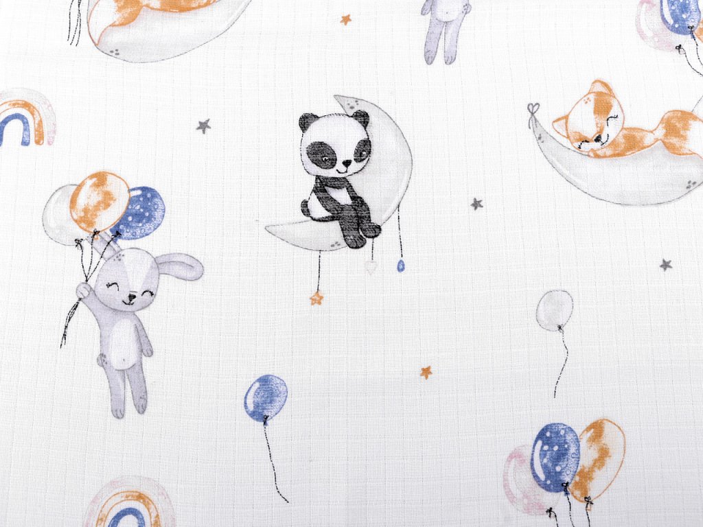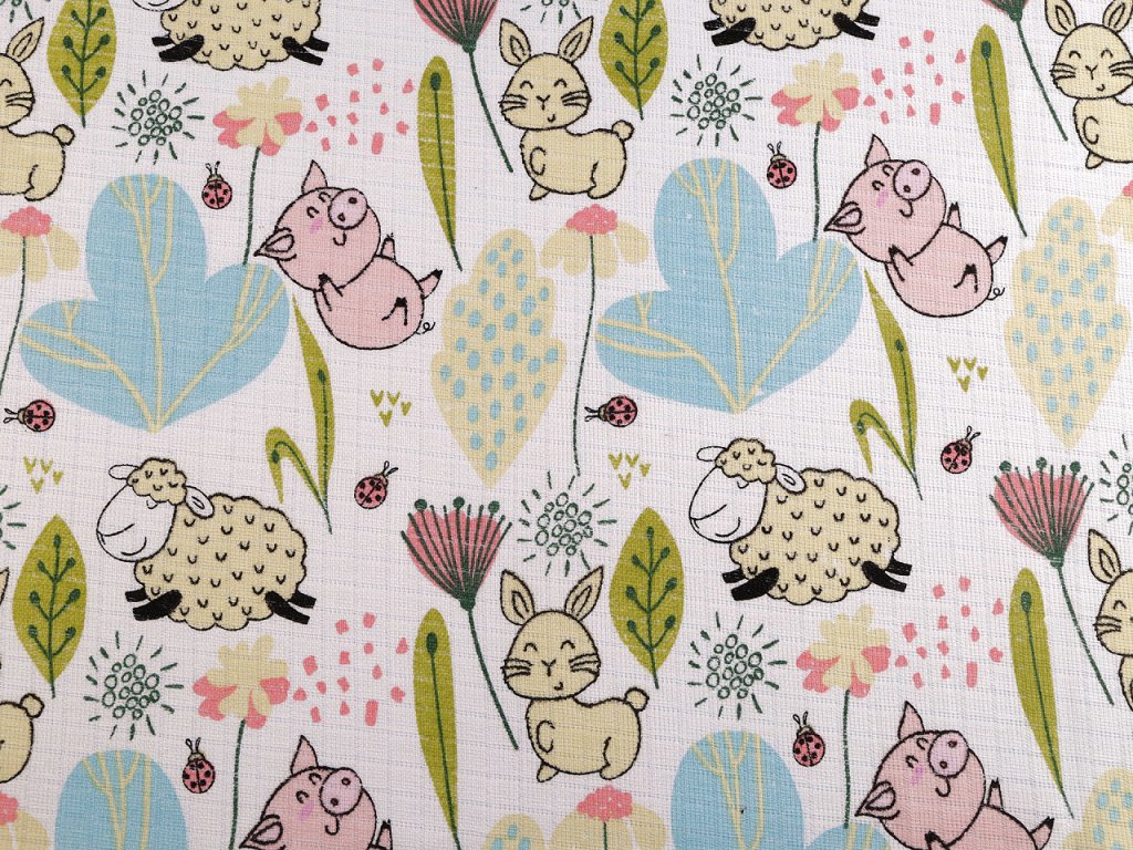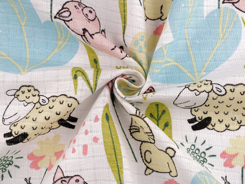 Bavlněná plenkovina s obrázky zvířátek je vzdušná a příjemná na dotek. Můžete z ní ušít plenky, baldachýny, bryndáčky apod.
