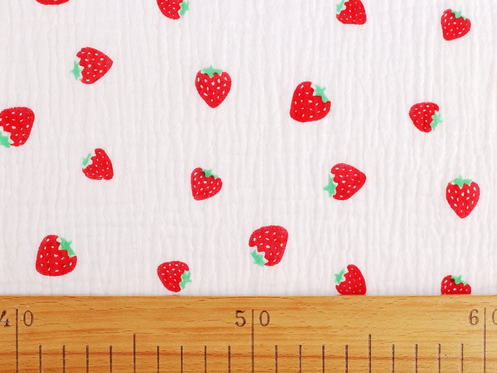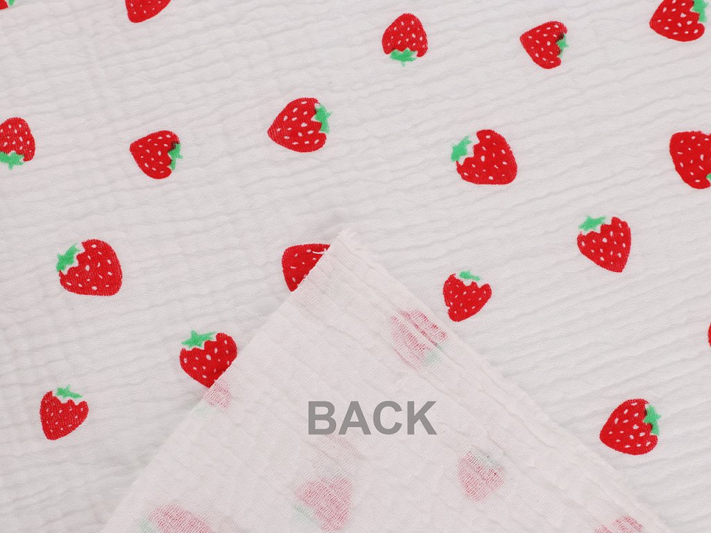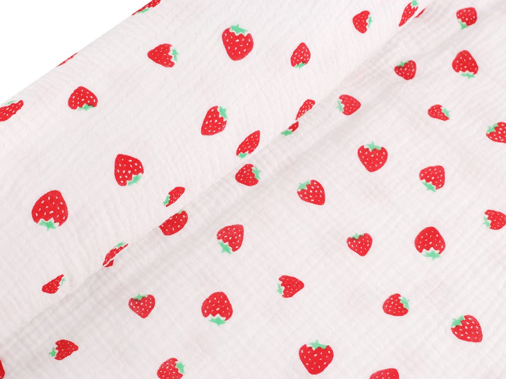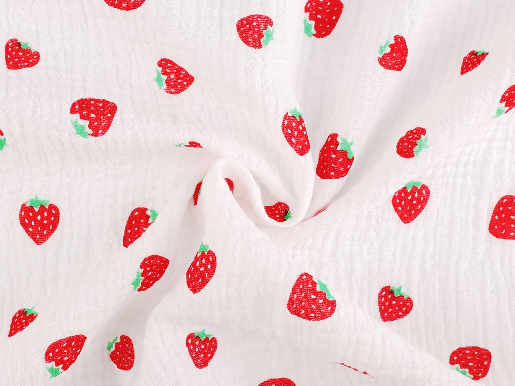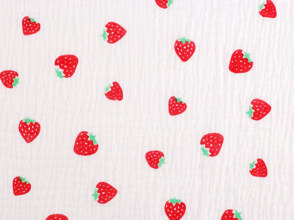 Mušelín s potiskem jahod je lehký, prodyšný a neprůsvitný, tkaný ze speciálně vyhlazených vláken. Vyniká dostatečnou pevností a odolností, je ze dvou vrstev spojených neviditelnými stehy. Pokožka si ho zamiluje převážně v letních měsících. Velkou výhodou je, že se nemusí žehlit.