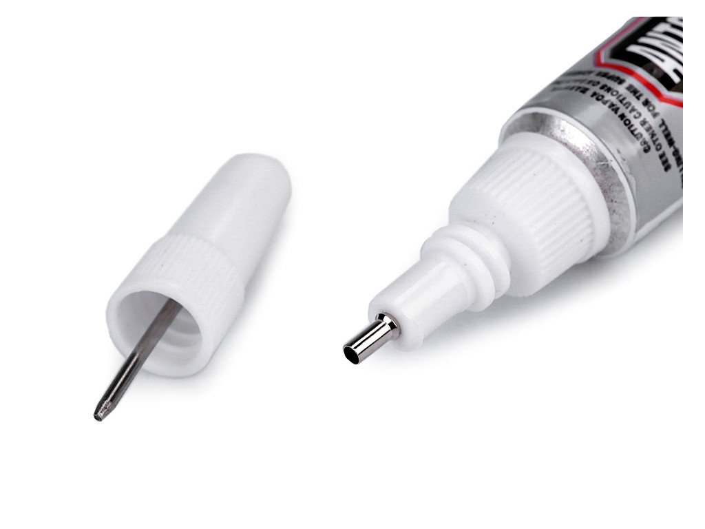 Transparentní, voděodolné lepidlo je vhodné na lepení kovu a skla, šperkaři jej používají na přilepení šatonových kamenů a kabošonů. Je určené na hladké, nepórovité materiály, je nehořlavé, přetíratelné. Má nasazovací špičku pro přesné a precizní nanesení lepidla. Musí se natřít obě strany, počkat 2-10 min. a pak k sobě stisknout. Doba schnutí je 24-72 hod.