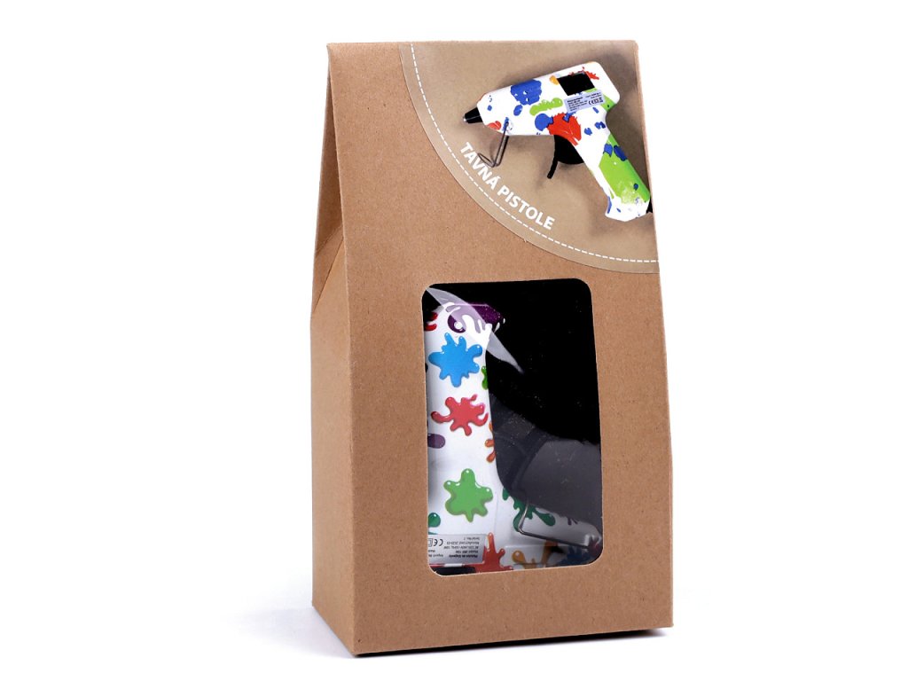 Mini lepicí neboli tavná pistole v dárkové krabičce bude skvělým dárkem pro každého kreativního nadšence. Je skvělým pomocníkem při domácím tvoření nebo na vašich kreativních cestách. Je vyrobená z plastu s potiskem barevných cákanců. Součástí balení jsou 2 tyčinky o průměru 7 mm a délce 10 cm.