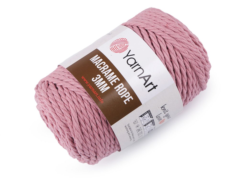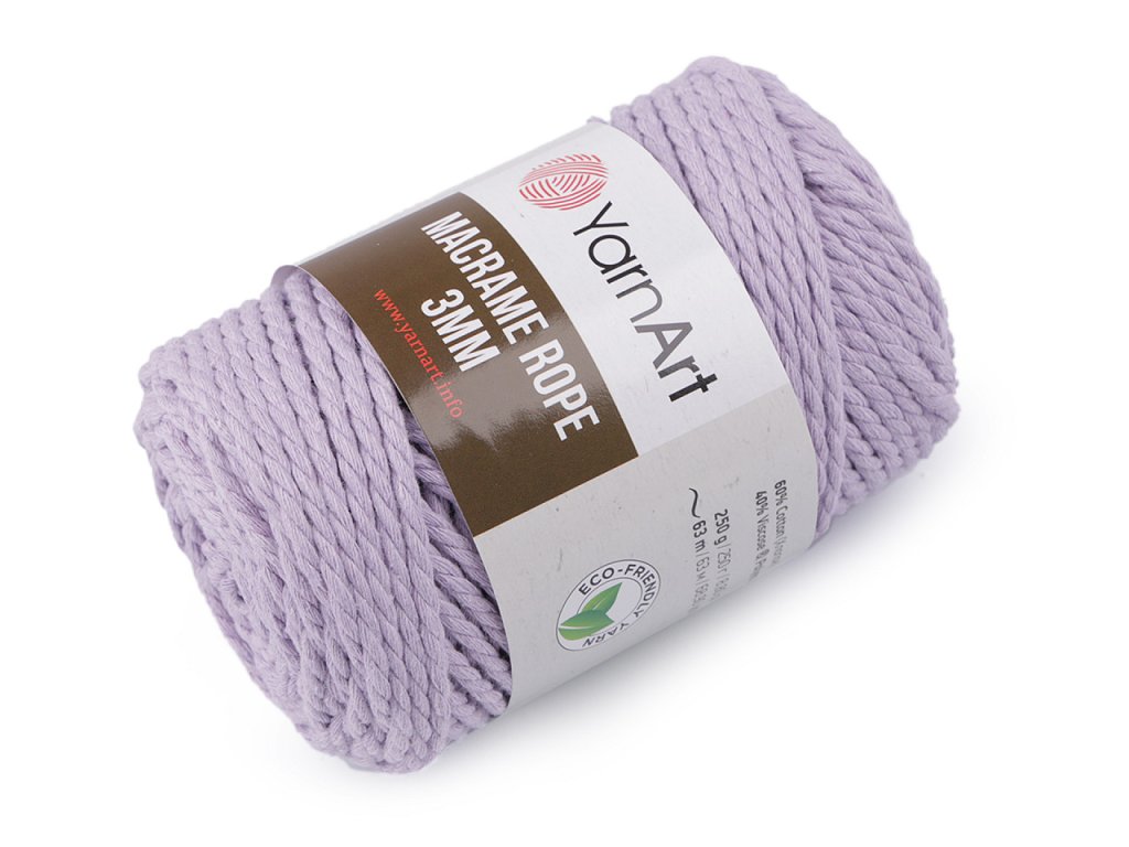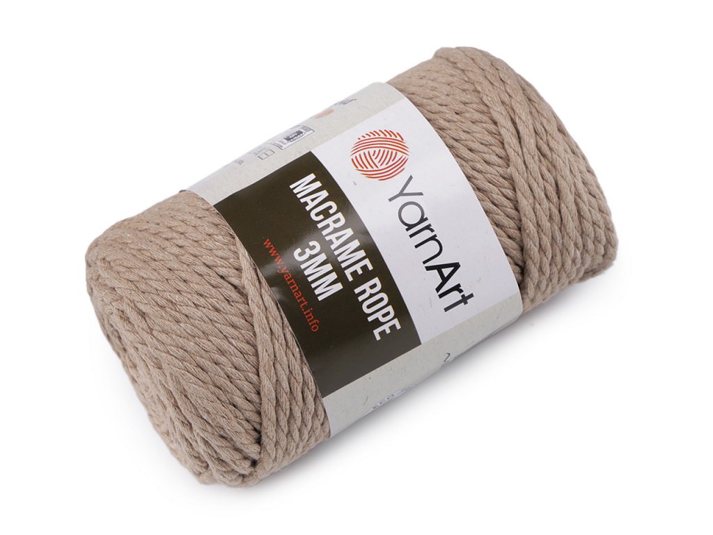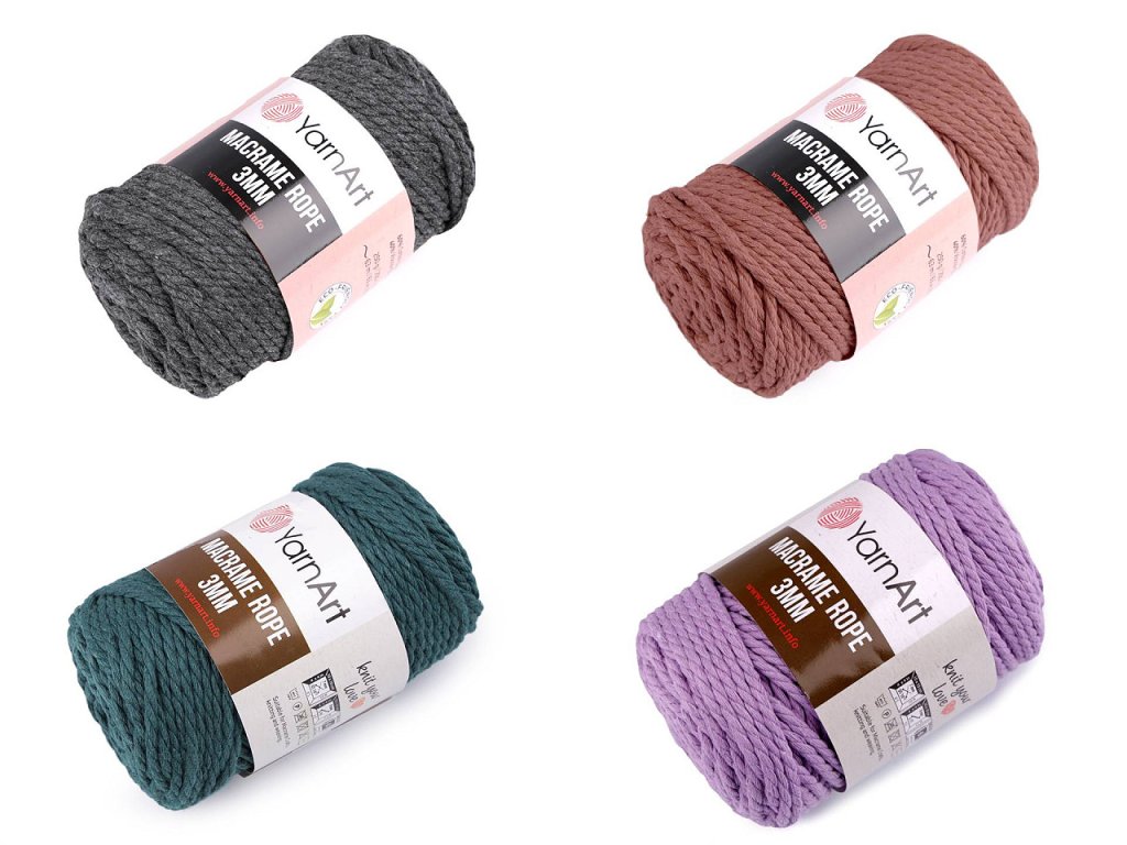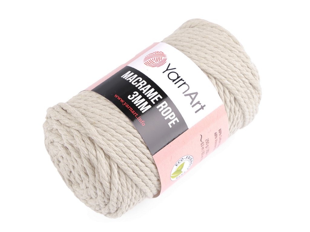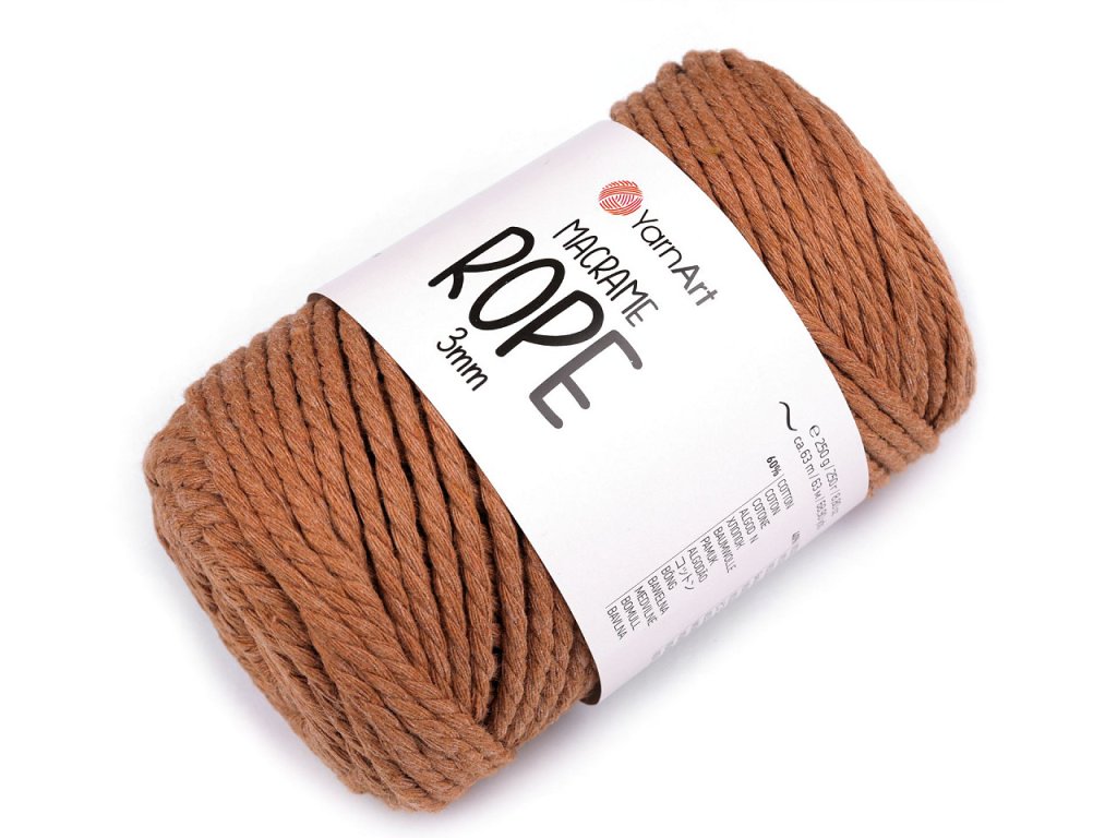 Příze Macrame rope je kroucená a připomíná provázek. Využijete ji na pletení nebo háčkování pufů, košíků, koberečků i tašek. Díky svému zpracování je vhodná také na výrobu macramé dekorací.