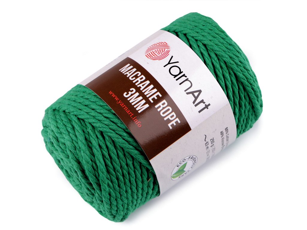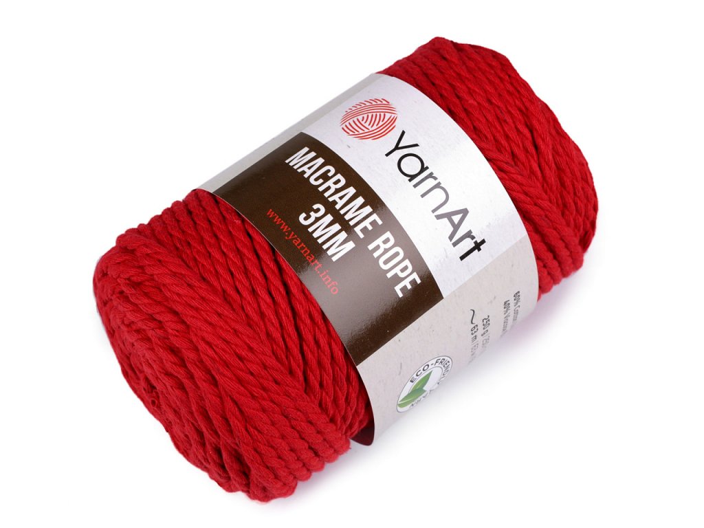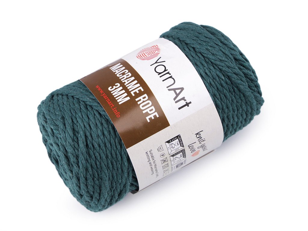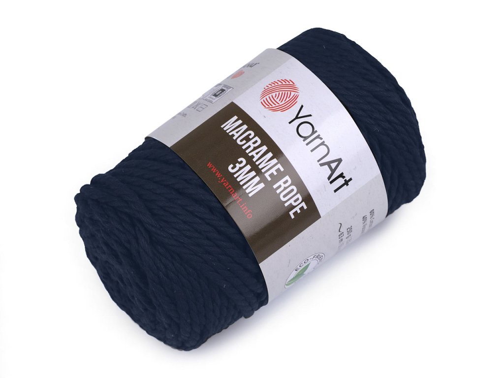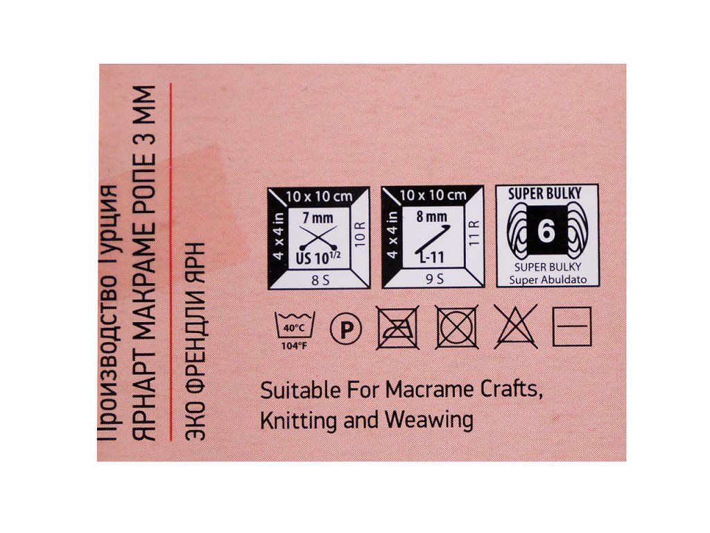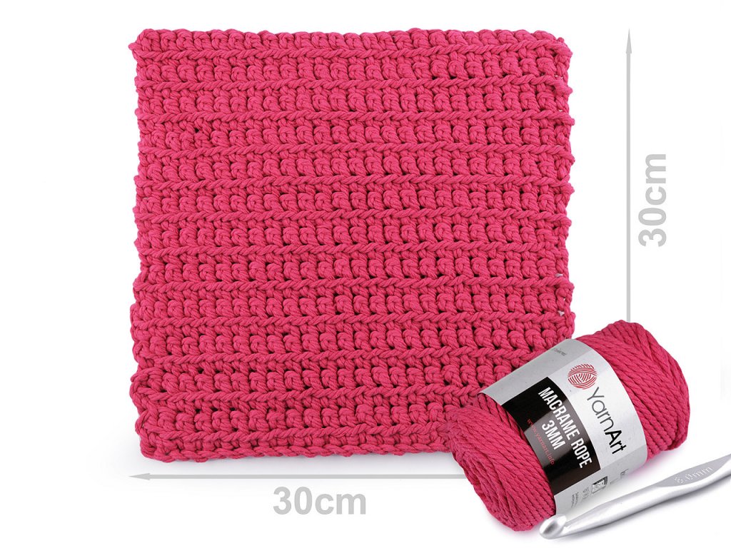 Příze Macrame rope je kroucená a připomíná provázek. Využijete ji na pletení nebo háčkování pufů, košíků, koberečků i tašek. Díky svému zpracování je vhodná také na výrobu macramé dekorací.