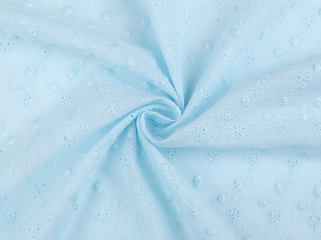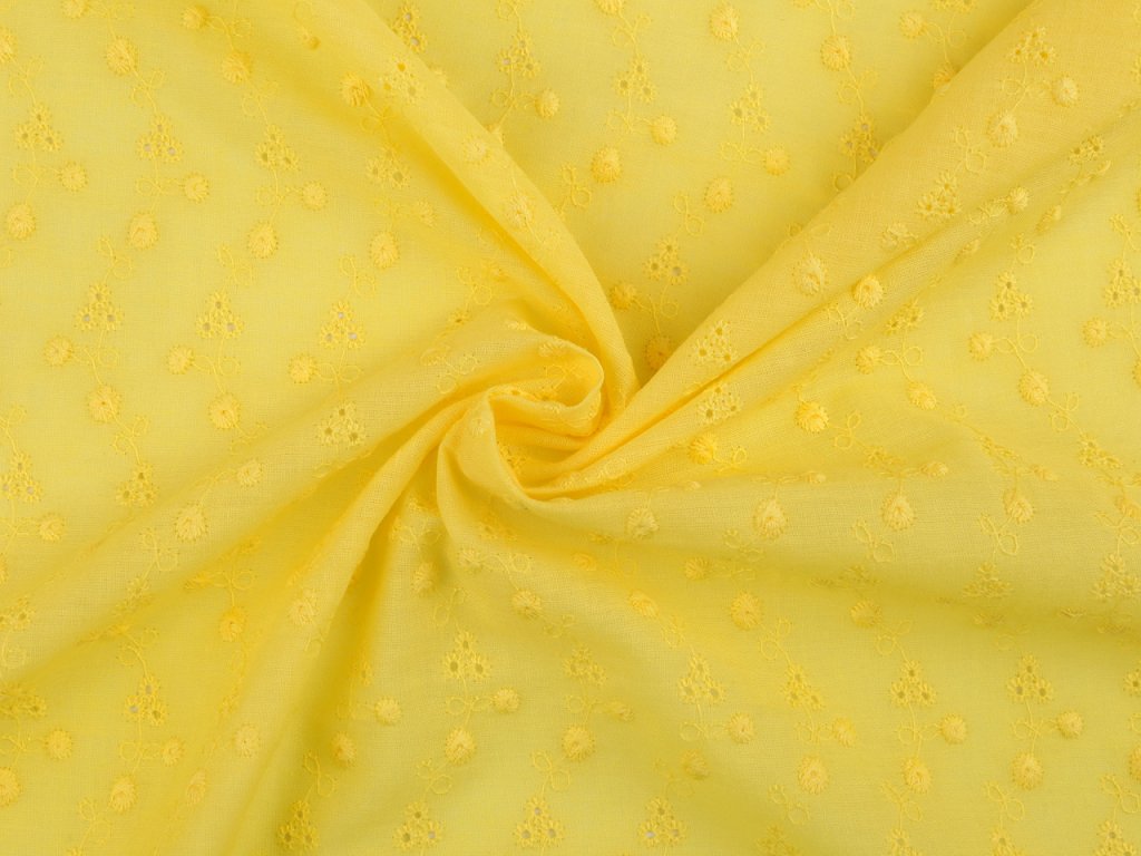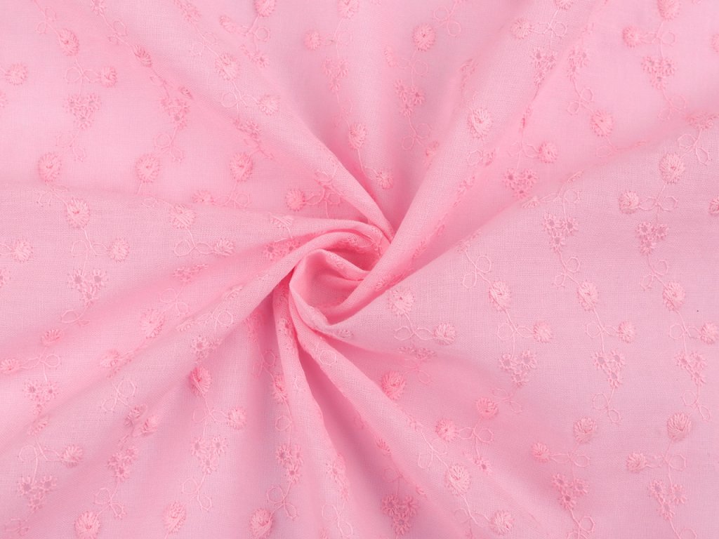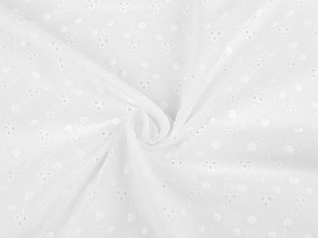 Bavlněnou madeiru zdobí dírkovaná výšivka s květy. Je lehká a vzdušná, vhodná do teplého letního počasí. Využijete ji na šití šatů, halenek, sukní, tunik, dívčích šatiček apod. Je vhodná i na ušití dekorací - polštářů, ubrusů, záclonek, závěsů apod.