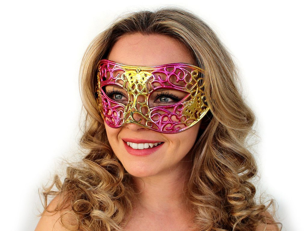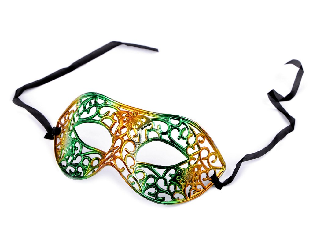 Efektní škrabošku využijete jako doplněk na karnevaly, párty, večírky nebo plesy. Zdobí ji zajímavé barevné přechody v metalických barvách. Je vyrobená z pevného plastu, který dobře drží tvar. Uvazuje se pomocí stuhy.