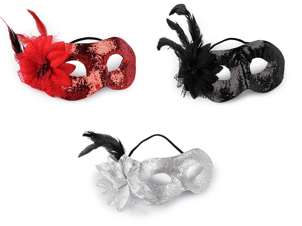 Karnevalová škraboška vám dodá tajemný a svůdný vzhled. Využijete ji na různé večírky, párty, karneval apod. Škraboška je celá pokrytá třpytivými glitry. Její bok zdobí textilní květ a peří.