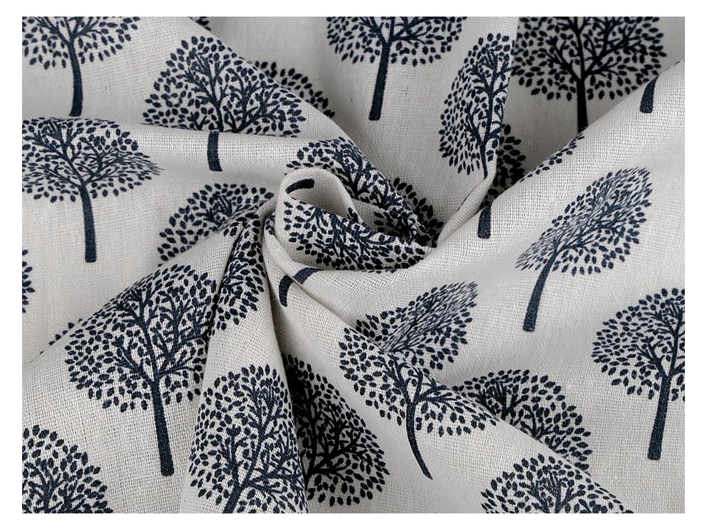 Hrubší bavlněná látka svou plátnovou vazbou imituje látky ze lnu. Zdobí ji motiv stromů ve skandinávském stylu. Využijete ji na šití ubrusů, polštářů, tašek nebo oblíbených dětských teepee.