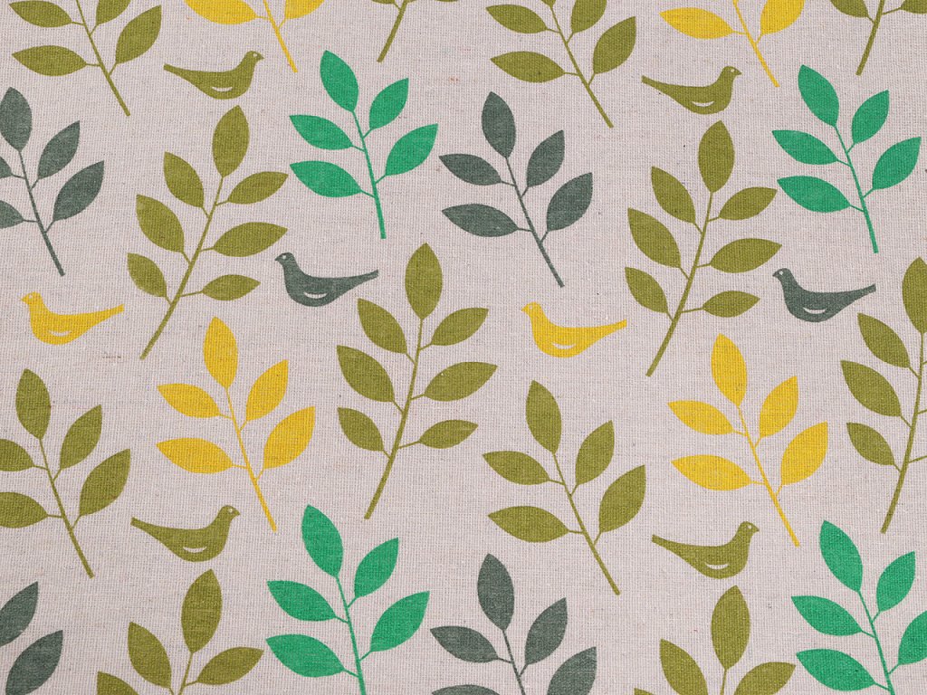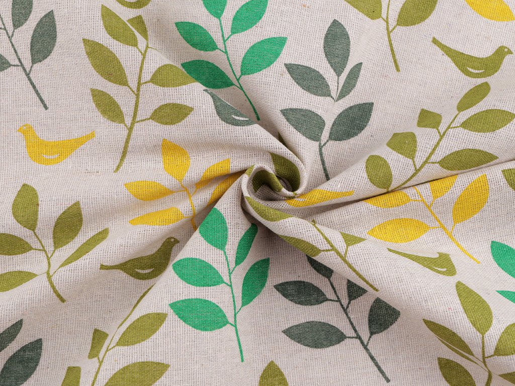 Látku s potiskem listů využijete na šití ubrusů, prostírání, tašek, dekoračních polštářů apod. Svou hrubou plátnovou vazbou připomíná len.
