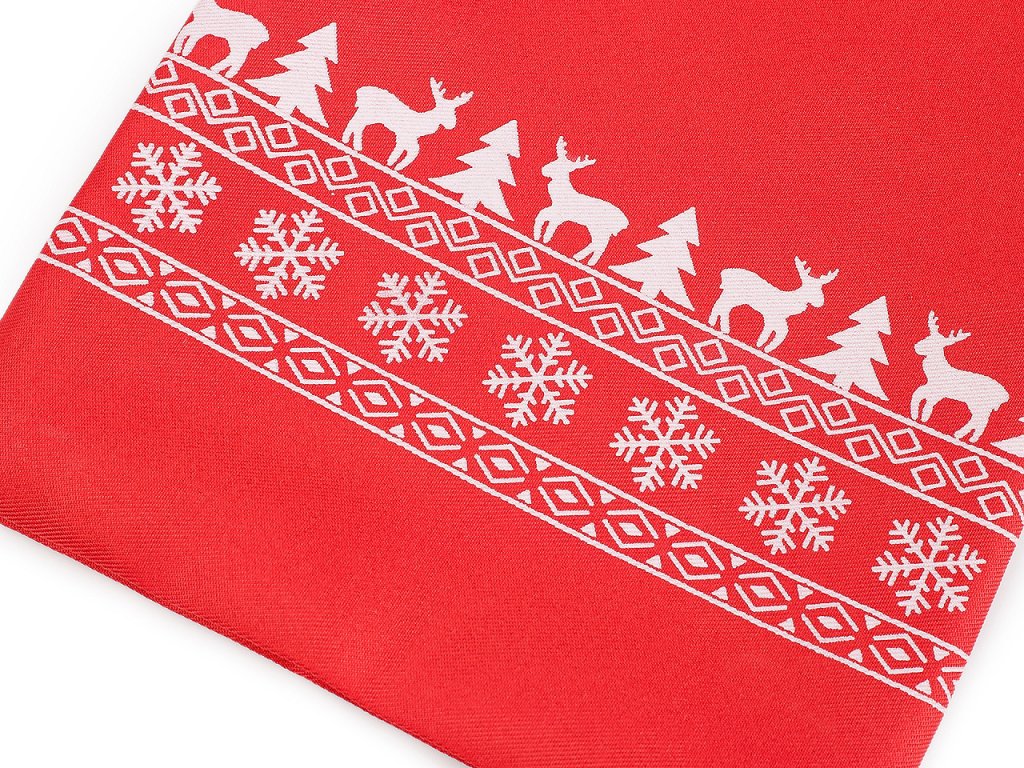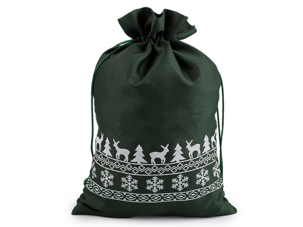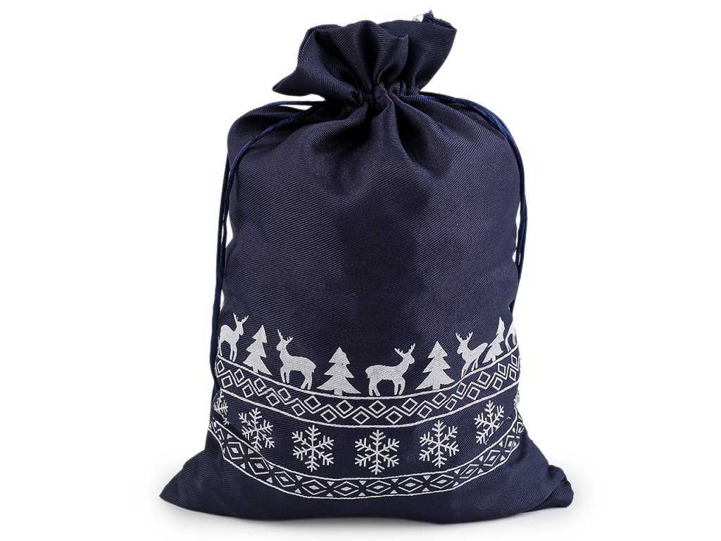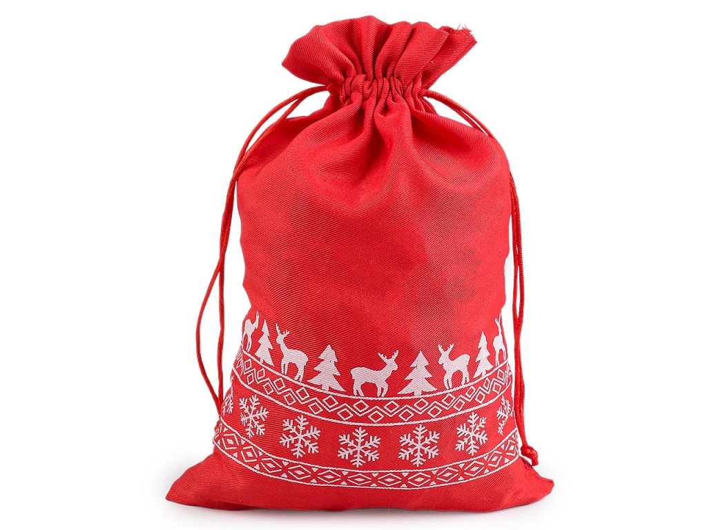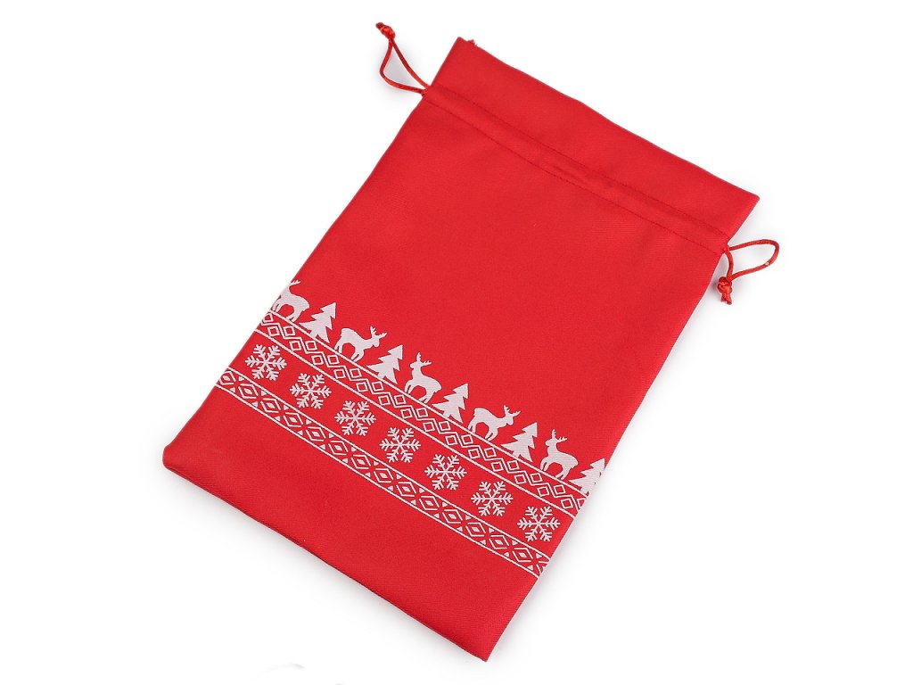 Vánoční dárkový pytlík je z obou stran ozdobený potiskem sobů, stromečků a vloček. Můžete ho použít na dárky nebo ho naplnit mikulášskou nadílkou, ušetří vám čas při balení. Dá se naaranžovat i jako vánoční dekorace. Stahuje se pomocí kulatých saténových šňůrek, dárku dodá osobní kouzlo a půvab.