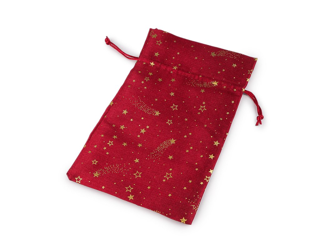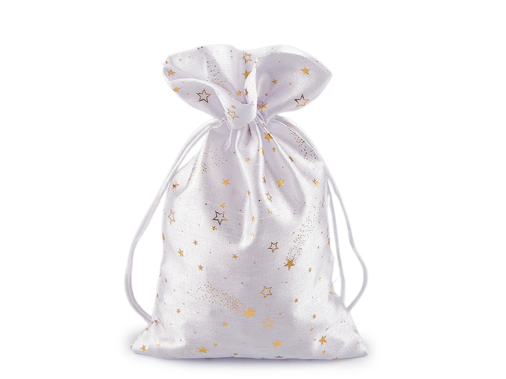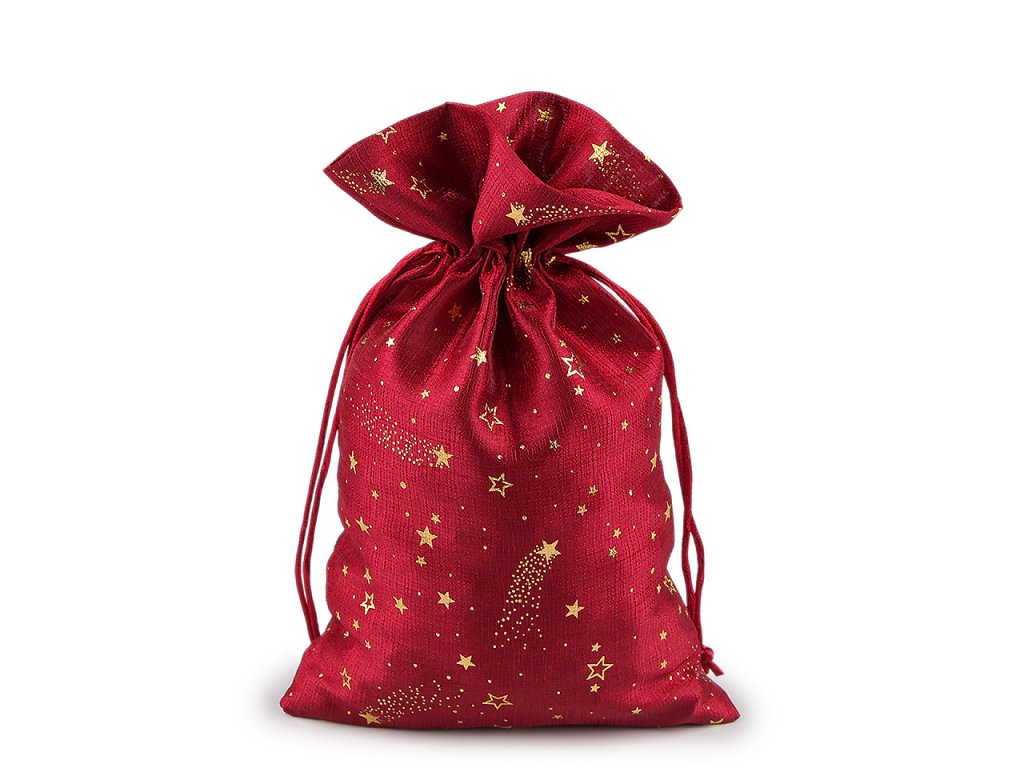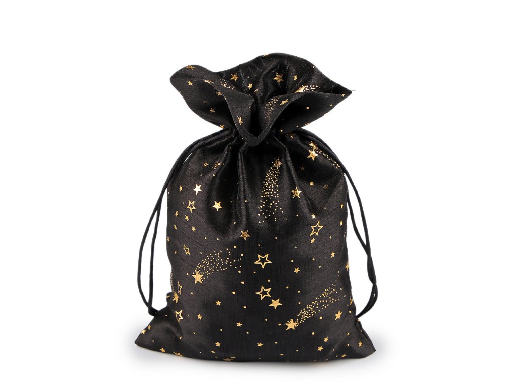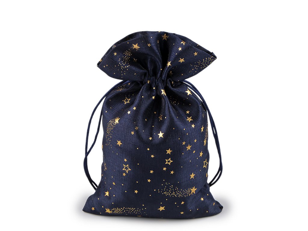 Vánoční dárkový pytlík je na obou stranách ozdobený potiskem zlatých metalických hvězdiček. Působí elegantně a luxusně, můžete ho použít na dárky nebo ho naplnit mikulášskou nadílkou, ušetří vám čas při balení. Dá se naaranžovat i jako vánoční dekorace. Stahuje se pomocí kulatých saténových šňůrek, dárku dodá osobní kouzlo a půvab.
