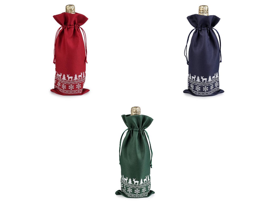 Vánoční dárkový pytlík je z obou stran ozdobený potiskem sobů, stromečků a vloček. Je určený na zabalení lahví a jiných podlouhlých dárků. Pytlík je dostatečně vysoký, ať už se rozhodnete pro dárek s alkoholem nebo s domácí limonádou, ušetří vám čas při balení. Stahuje se pomocí kulatých saténových šňůrek, dárku dodá osobní kouzlo a půvab.