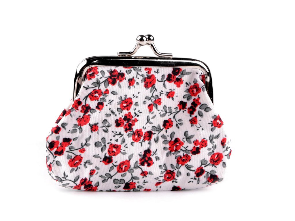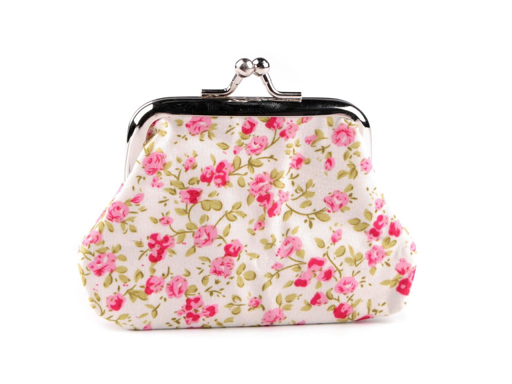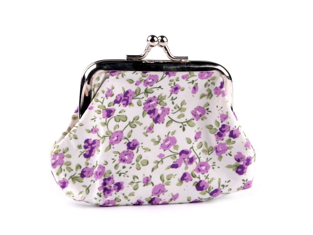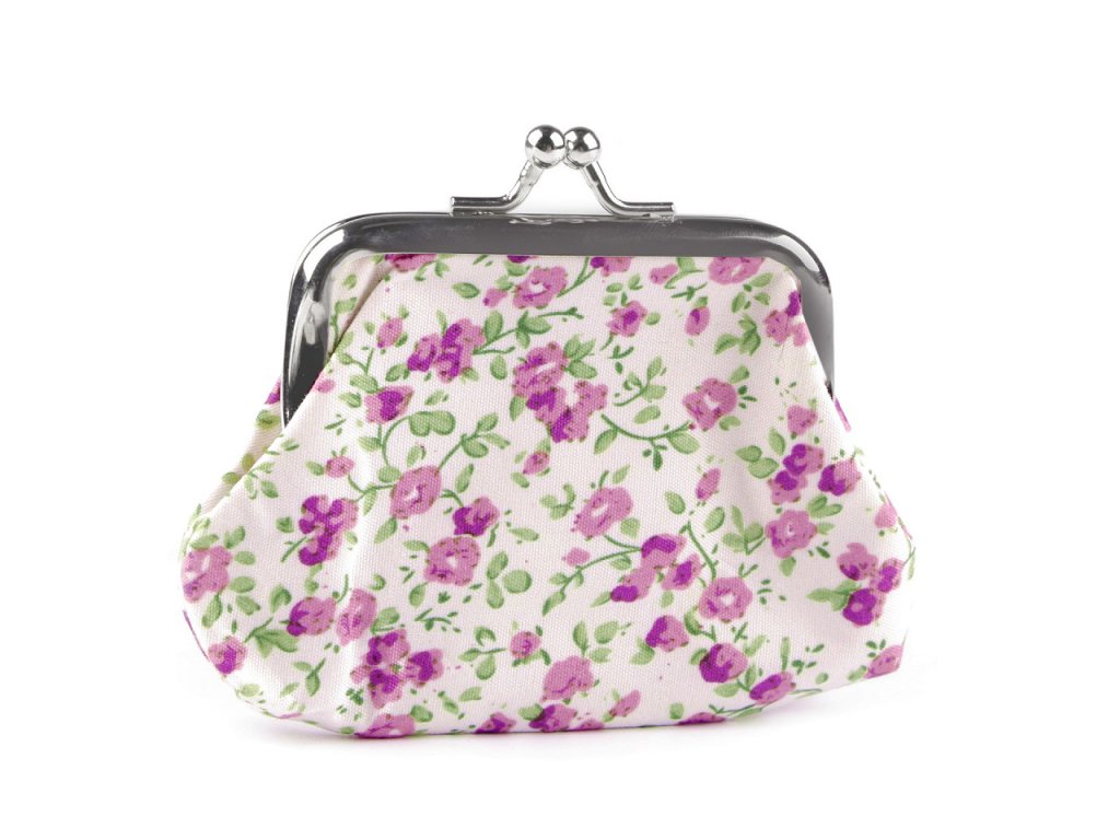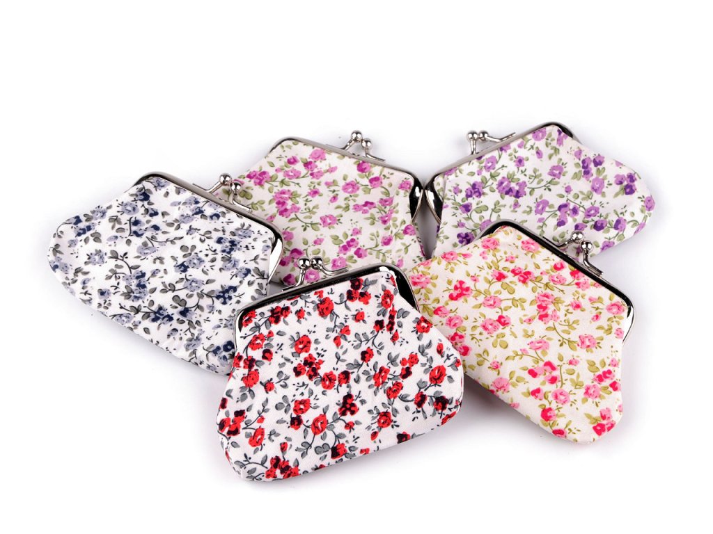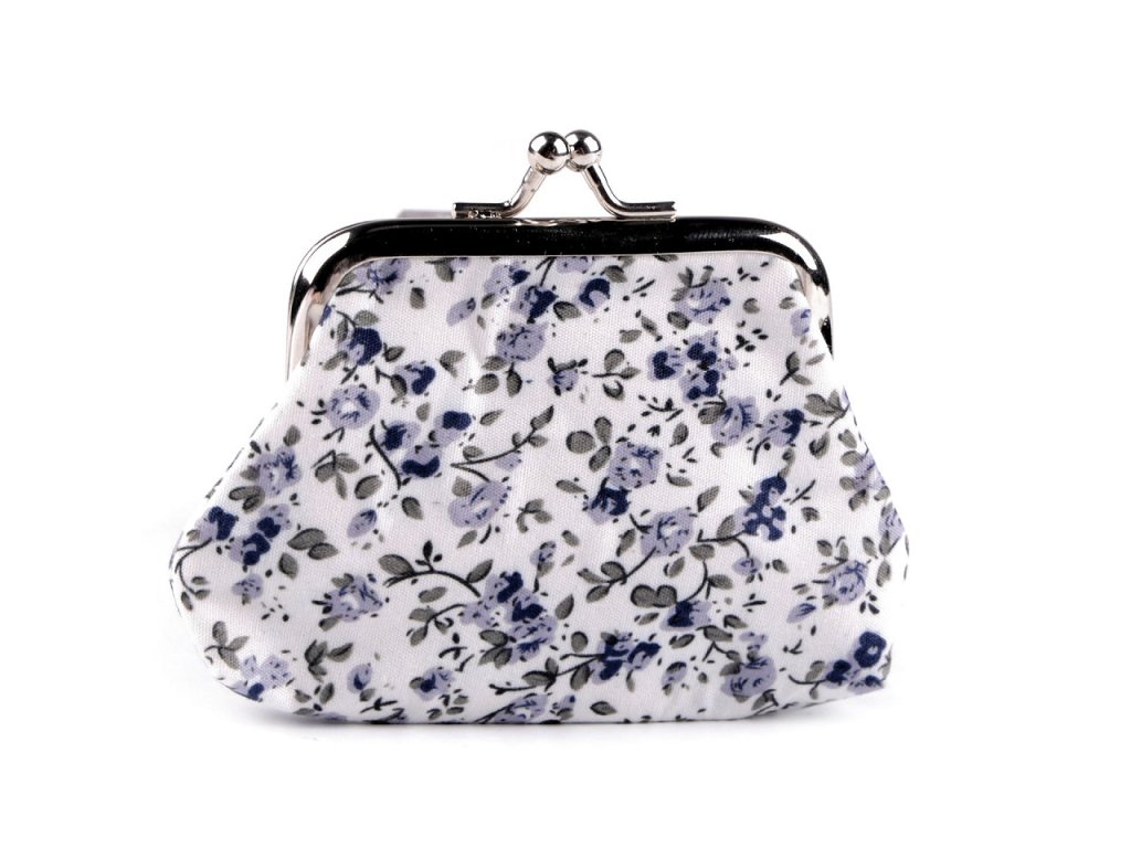 Romantická peněženka s motivem drobných květů je malá, vhodná na drobné mince a klíče. Můžete do ní ukrýt také bankovky nebo dekorativní kosmetiku. Je lehká, textilní, nahoře zakončená kovovým rozevíracím rámečkem se zapínáním.