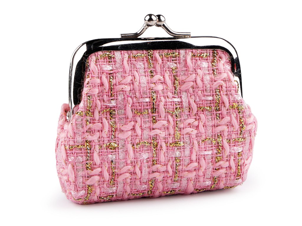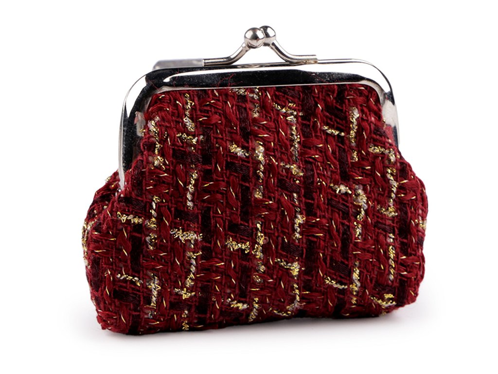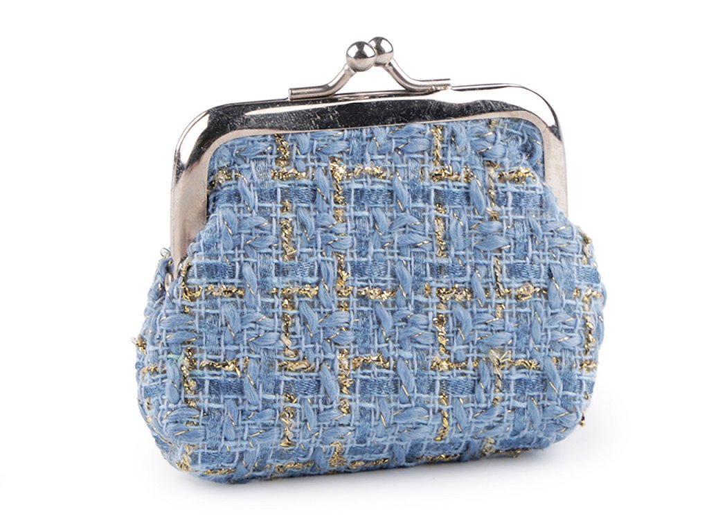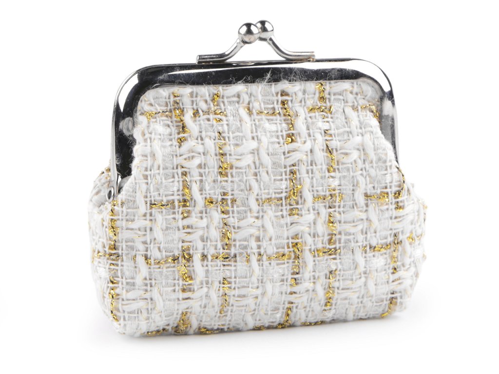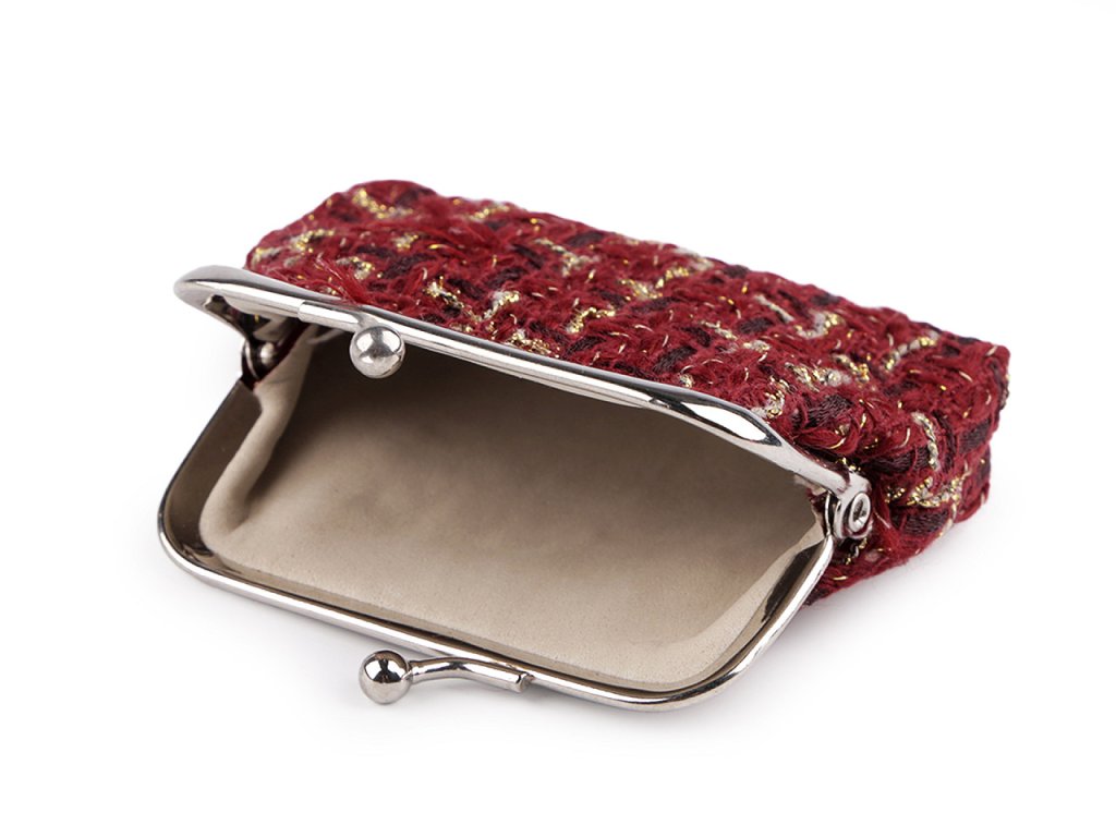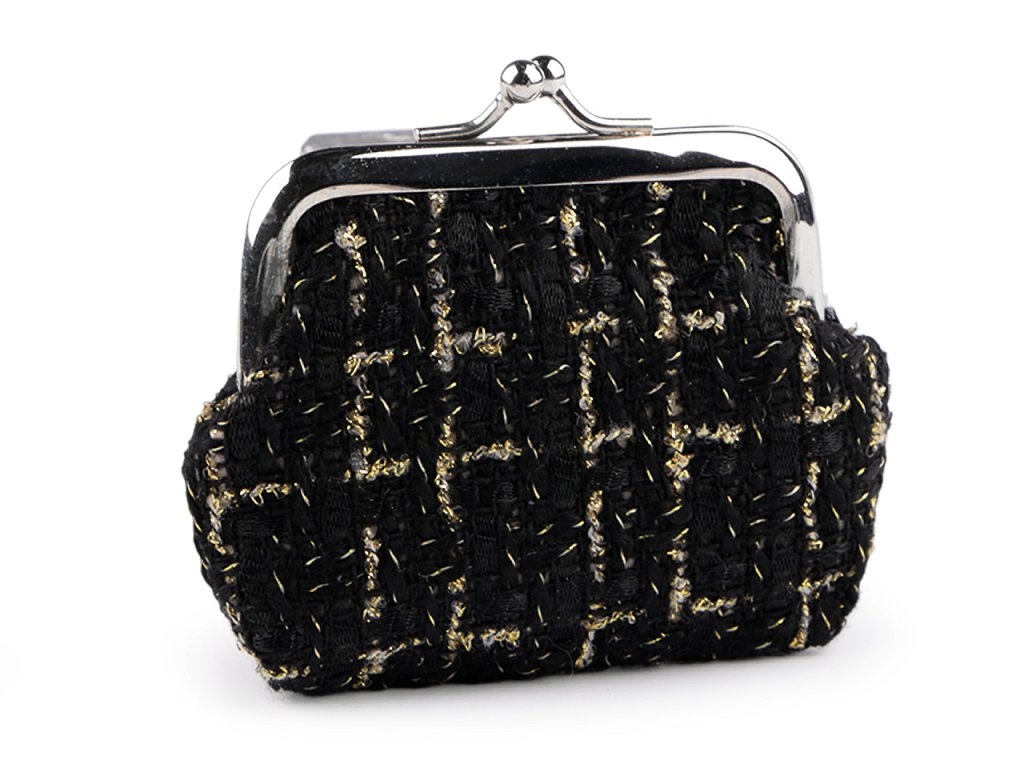 Atraktivní peněženka s lurexem ve stylu Chanel je malá, vhodná na drobné mince a klíče. Můžete do ní ukrýt také bankovky nebo dekorativní kosmetiku. Je lehká, textilní, nahoře zakončená kovovým rozevíracím rámečkem se zapínáním.