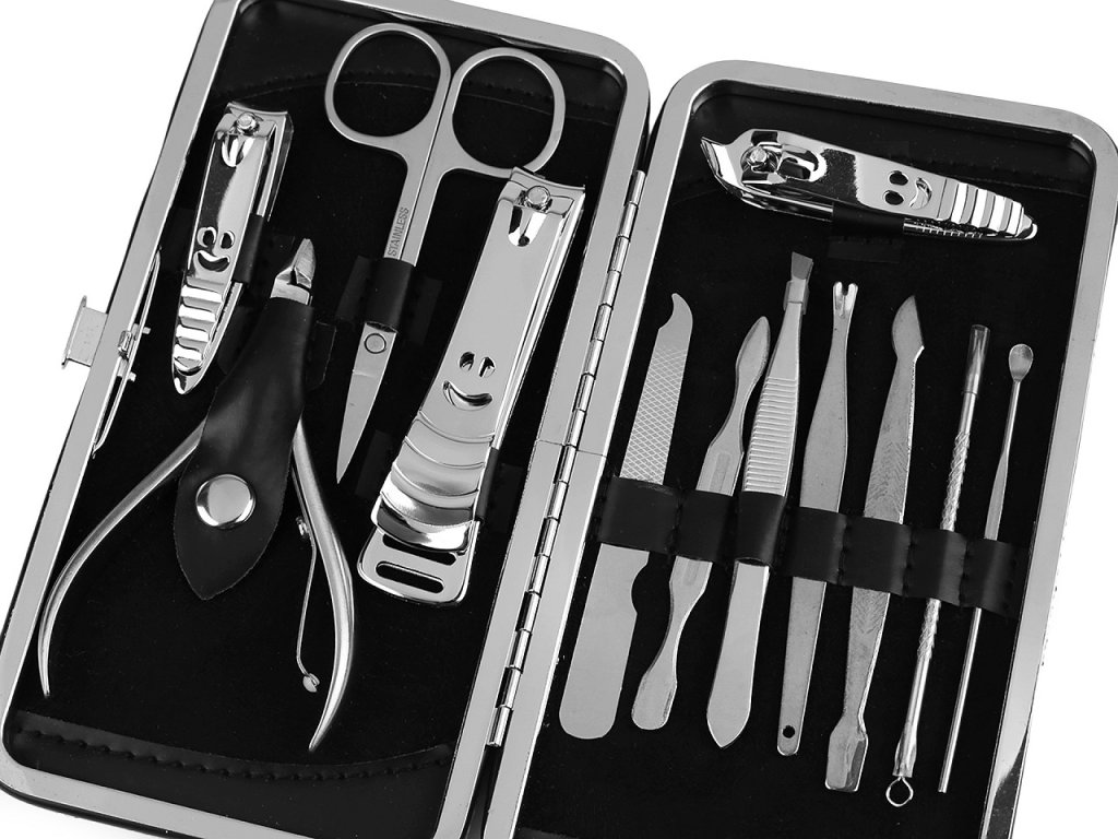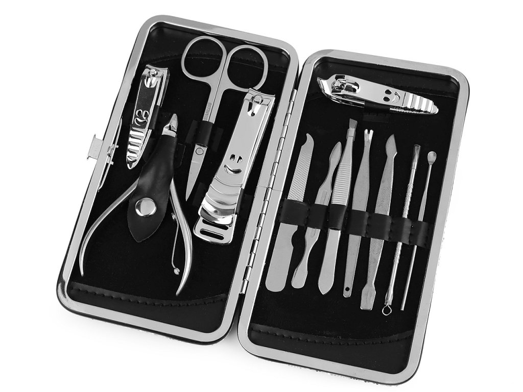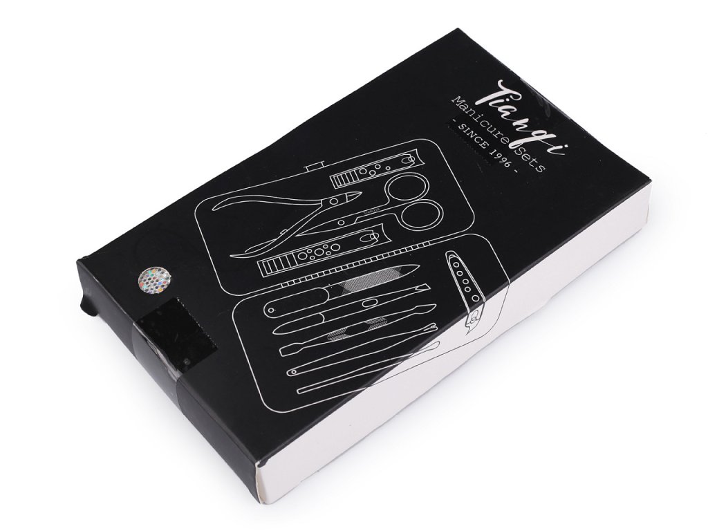 Manikúra obsahuje: nehtové nůžky, pilník, pinzetu, 5 kusů manikúrových nástrojů a 4 kusy nehtových kleští.