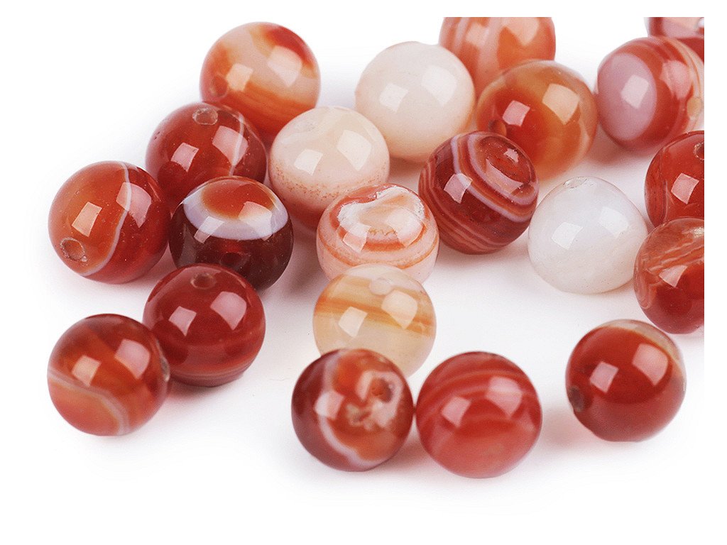 Přírodní minerální korálky červeného achátu jsou oblíbené především šperkaři pro svou jedinečnou kresbu a barvy. Svou velikostí jsou ideální na výrobu Buddhových náramků. Jsou oblíbené na techniku drátování, v kombinaci s drahými kovy, ale i s obyčejnými drátky. Skvěle vypadají i na jednoduchých návlekových šňůrách, které zajímavě ozvláštní.