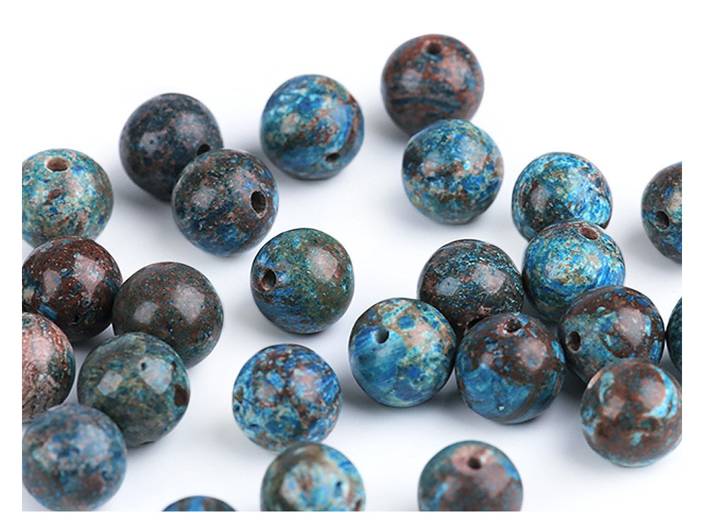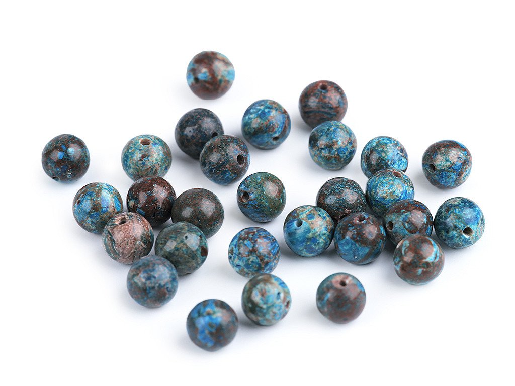 Syntetické korálky chryzokolu jsou oblíbené především šperkaři pro svou zajímavou kresbu a barvu. Svou velikostí jsou ideální na výrobu Buddhových náramků. Jsou oblíbené na techniku drátování, v kombinaci s drahými kovy, ale i s obyčejnými drátky. Skvěle vypadají i na jednoduchých návlekových šňůrách , které zajímavě ozvláštní.