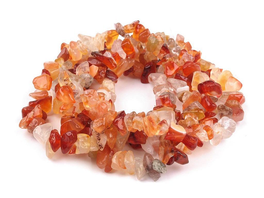 Minerálové zlomky karneolu jsou jedny z nejvariabilnějších bižuterních prvků. Jsou půvabné svým průsvitem a přechody barev. Tyto korálky jsou jedním z našich hitů, což je dáno jejich kvalitou a velmi příznivou cenou. Na jedné šňůře je cca 217 zlomků.