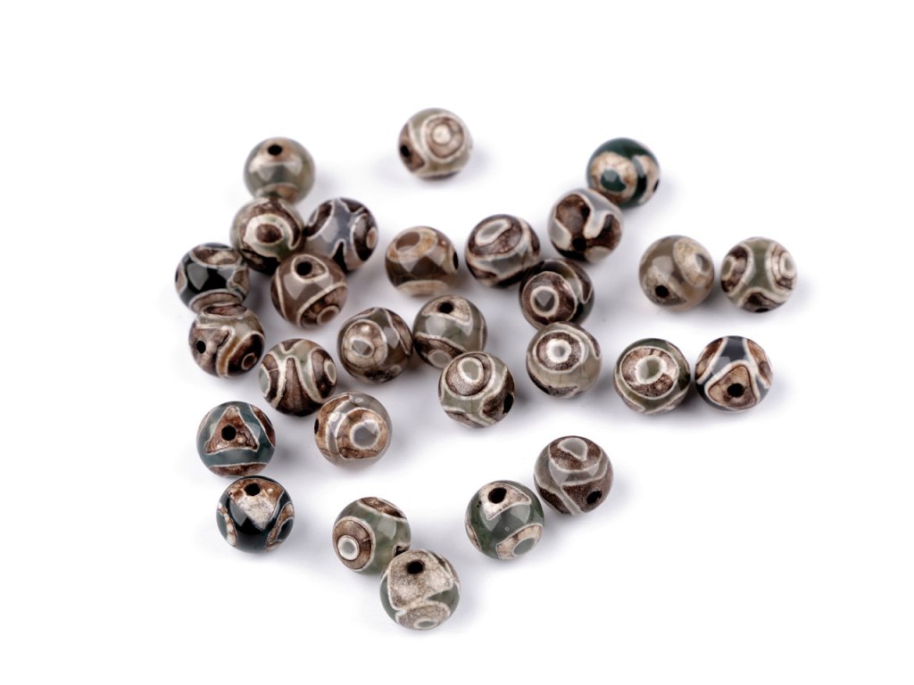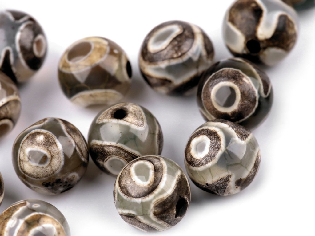Tibetské kulaté korálky z přírodního achátu jsou speciálně upravené do tzv. dZi stylu. Každý korálek je unikátní. Jsou oblíbené především šperkaři pro svou jedinečnou kresbu s oky. Svou velikostí jsou ideální na výrobu Buddhových náramků. Jsou oblíbené na techniku drátování, v kombinaci s drahými kovy, ale i s obyčejnými drátky. Skvěle vypadají i na jednoduchých návlekových šňůrách, které zajímavě ozvláštní.